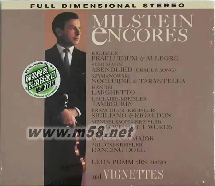 ENCORES & VIGNETTES小提琴精選集 立體聲名盤(pán)(TAS專(zhuān)業(yè)推介發(fā)燒名盤(pán))(m58.net) 偉大的小提琴家Nathan Milstein (米爾斯坦)小品集,兩張著名作品,包括Encores (安可)及Vignettes (花絮)全數(shù)歌曲孤注一擲,一碟落齊。技藝高超的他,當(dāng)演奏這些作品時(shí),沒(méi)半點(diǎn)手軟,徹底地表現(xiàn)自我,當(dāng)全神貫注地聽(tīng),即可感受其微妙之處,從米爾斯坦的選擇看到,他不需要?jiǎng)e人的評(píng)價(jià),對(duì)他之任何批評(píng)只當(dāng)作多余,他嘗試模仿Kreisler (克萊斯勒)拉奏,更愛(ài)改編其他作曲家作品。非常乾凈的錄音、清晰之名琴音色,顫動(dòng)的琴弦,米爾斯坦從容不迫之平順呼吸聲,在空氣中泛濫擴(kuò)散,音樂(lè)大師,如在眼前,就在你耳邊復(fù)活起來(lái)。