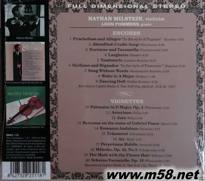 ENCORES: 01. Kreisler: Praeludium and Allegro “In the style of Pugnani” 02. Schumann: Abendlied (Cradle Song) 03. Szymanowski: Nocturne and Tarantella 04. Handel: Larghetto 05. Leclaire-Kreisler: Tambourin 06. Kreisler: Siciliano and Rigaudon “In the style of Francoeur” 07. Mendelssohn-Kreisler: Song Without Words 08. Brahms: Waltz in A Major 09. Poldini-Kreisler: Dancing Doll Recorded at Capitol Studio A, New York City, April 22, 24 & 26, 1957 VIGNETTES: 10. Wieniawski: Polonaise in D Major, Op. 4 11. Falla: Asturiana 12. Falla: Jota 13. Ravel: Berceuse on the name of Gabriel Faure 14. Sarasate: Romanza Andaluza 15. Schumann: Traumerei 16. Bach: Air 17. Novacek: Perpetuum Mobile 18. Tchaikovsky: Melodie, Op. 42, No.3 19. Debussy: The Maid with the Flaxen Hair 20. Wieniawski: Scherzo-Tarantelle, Op. 16 Recorded at Capitol Studio A, New York City, March 16, 1959 NATHAN MILSTEIN, violinist LEON POMMERS, piano