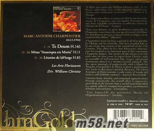 馬克.安東.夏邦泰爾是十七世紀法國著名作曲家,他早年曾赴羅馬隨神劇先驅卡里西米習藝,回到巴黎之后跟大文豪莫里哀合作迅速竄紅,隨后陸續出任兩家重要教堂的音樂總監,其作品以十七齣歌劇和若干宗教音樂最為膾炙人口。本片收錄三首宗教合唱曲。《謝恩讚美歌》原本是為教堂儀式而寫,卻也被拿到慶祝法國戰爭勝利的場合演出,因此其管絃樂前奏曲被現代西歐電視網當做片頭音樂,可謂其來有自。《圣母升天彌撒》乃夏邦泰爾最成熟之作,除了在圣母升天日應景,也曾為國會開議場合演出。《圣母瑪麗亞連禱》則情感親密,色彩豐富。指揮家克利斯提是出身哈佛和耶魯的大鍵琴家,自創合奏團之后,以復興拉摩和夏邦泰的作品為己任,成為唱片大獎得獎大王。本片無比高貴的精妙演出,足以讓愛樂者體會到這些作品無疑就是路易十四時代的最佳圣樂。法國「音樂世界」雜志震撼推薦