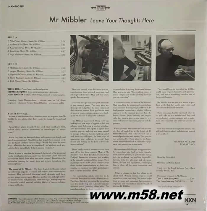 LPMR MIBBLE把你的想法留在這里 LEAVE YOUR THOUGHTS HERE 黑膠(m58.net) 挪威著名音樂家與制作人LPMR MIBBLER發(fā)行的第三張專輯,邀請了挪威眾多一流音樂家演奏。這是一次多種樂器和各種流派的美妙組合的音樂之旅。您將聽到挪威最優(yōu)秀的音樂家演奏的民謠、爵士樂、和電子樂。 THOM HELL PIANO BASS VOCALS AND GUITARS VIDAR ERSFJORD KEYS PROGRAMMING AND ELECTRONICS JORN RAKNES GUITARS OTHER STRINGS ,MUSICAL WAW AND SAMPLES