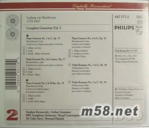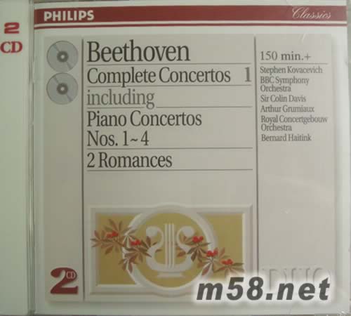 第1-4號鋼琴協奏曲 2首曲(雙碟 PHILIPS系列老版)(m58.net) 收錄了貝多芬第一至第四鋼琴協奏曲和兩首小提琴浪漫曲,這幾首作品涵蓋了他人生的不同時期,風格各異。讓你換一種眼光看貝多芬,遠離厚重與龐大的配器,音樂中出現難得一見的柔美,整張碟充滿著天真與爛漫,傾聽不一樣的貝多芬。由鋼琴大師科瓦切維奇和小提琴宗師格魯米歐演奏,戴維斯和海汀克分別指揮BBC交響樂團和荷蘭皇家音樂會堂樂團演奏。演繹非常出色,鮮亮、清晰的錄音使本碟具有很強的珍藏價值。