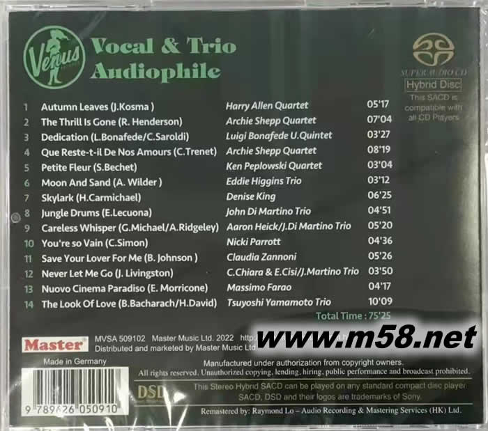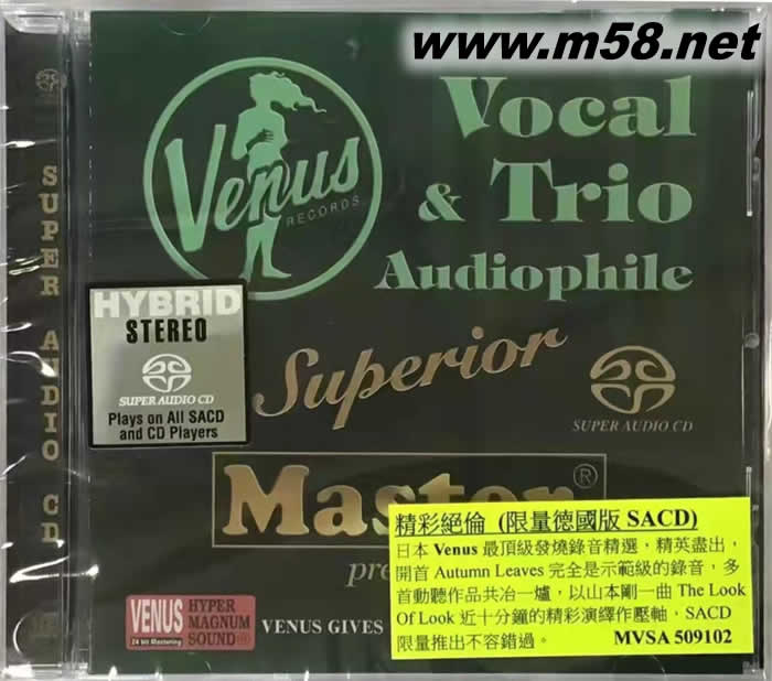 爵士精選 - 精彩絕倫Venus Vocal & Trio Audiophile Superior SACD VENUS出品(m58.net) 壓軸山本剛的The Look Of Love 十分多鐘的現場錄音演錄俱佳完全是示范級的超正之選,多年來Venus 罕有雙層SACD 日本著名爵士品牌Venus Records 最頂級發燒錄音精選,收錄多張上榜及熱賣專輯,精英盡出:開首一曲選自Harry Allen Quartet 的Autumn Leaves完全是示范級的錄音,吉他的響起音效無懈可擊越聽越精彩,還有Archie Shepp Quartet, Eddie Higgins Trio, 暢銷爵士發燒天后Nicki Parrott,並以山本剛一曲The Look Of Look近十分鐘的精彩演繹作壓軸!Venus Records罕見推出Hybrid SACD限量發行不容錯過。 限量德國版SACD