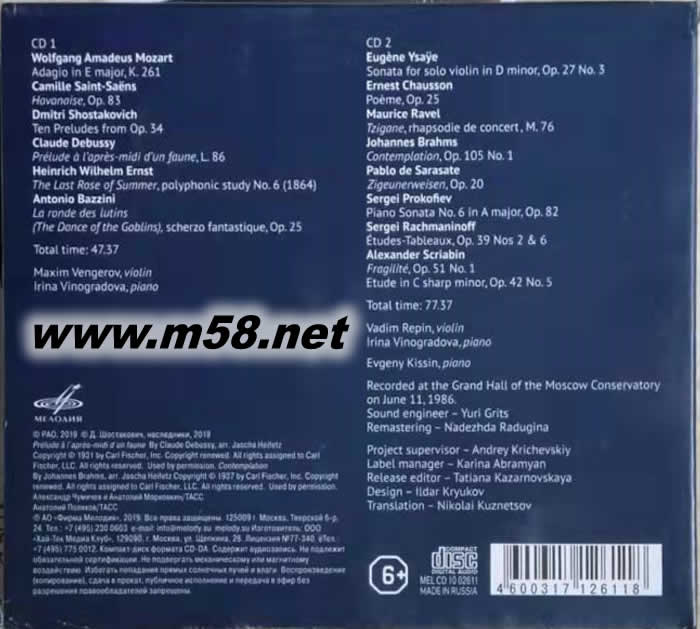 Mozart: Adagio for Violin and Orchestra in E, K261 Saint-Saëns: Havanaise, Op. 83 Shostakovich: Preludes for piano (24), Op. 34 Debussy: Prélude à l'après-midi d'un faune, L. 86 (Arr. Jascha Heifetz) Ernst, H W: 6 Polyphonic Studies: No. 6, The Last Rose of Summer Bazzini: La Ronde des lutins, Op. 25 Ysaÿe: 6 Sonatas for Solo Violin, Op. 27: No. 3, Ballade Chausson: Poème for Violin & Orchestra, Op. 25 Ravel: Tzigane Brahms: 5 Songs, Op. 105: No. 1, Contemplation (Arr. Jascha Heifetz) Sarasate: Zigeunerweisen, Op. 20 Prokofiev: Piano Sonata No. 6 in A major, Op. 82 Rachmaninov: 9 Etudes-tableaux, Op. 39 Scriabin: 4 Pieces, Op. 51: No. 1, Fragilité Scriabin: Étude Op. 42 No. 5 in C sharp minor
