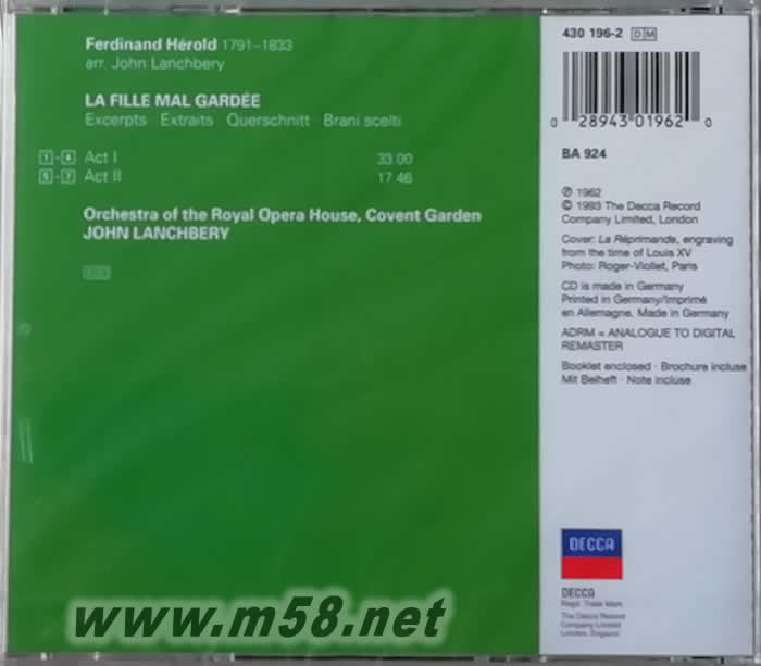 園丁的女兒 LA FILLE MAL GARDEE 奶媽(古典愛好者必備)(m58.net) 經典的音樂、精心的演繹、驚人的錄音 ——欣賞法國芭蕾舞劇《園丁的女兒》音樂唱片 法國浪漫派作曲家埃羅爾德 (Herold),對大家來說也許十分陌生,然而他創作的芭蕾舞劇《園丁的女兒》(La Fille Mal Gardee)音樂,卻是非常著名、讓人喜愛的,特別是在音響界影響頗廣,幾乎無人不知。 埃羅爾德先生出生於1791年,就學於巴黎音樂學院,1812年獲「羅馬獎」,1819年第一部歌劇演出於那不勒斯, 1816年起在巴黎創作歌劇和芭蕾舞劇音樂以終其年。芭蕾舞劇《園丁的女兒》是簡?道波瓦爾先生1789年創作的,最初的靈感來自鮑多伊畫的一幅油畫派生出的銅版畫(即唱片的封面),這幅畫中,女傭人衣衫零亂,正在哭泣,她的母親在麥草倉里斥責她,此時她的男友正匆忙奔上樓去,試圖逃走,畫面左上還隱約看見他奔上樓梯的兩條腿。其實這部舞劇向人們描述的是一個法國民間故事,故事發生在法國鄉村,寡婦絲莫恩準備把女兒莉絲嫁給一個財主的傻兒子,遭到女兒的強烈反抗,最后莉絲終於和自己的意中人湯馬斯結婚,並得到母親的祝福。該舞劇由於上演時較為匆忙,所以編配的音樂也是從一些流行旋律中改編而來,較為膚?#092;。1828年該劇在巴黎歌劇院上演時,才由埃羅爾德重新創作了總譜,他以原來的總譜為基礎,吸取了其中的精華部分,並創作了大量新的素材,也借用了一些當時頗為流行的古典名曲,如羅西尼的歌劇中的一些音樂,尤其是《塞維利亞的理髮師》中開始部分的合唱和《灰姑娘》中的暴風雨兩段還能分辨出來。然而到了1864年時,作曲家荷太爾又為柏林宮廷歌劇院寫了這部舞劇的一個全新的總譜,以適合那個時代人們的口味。一部舞劇竟然有三次音樂創作,也實屬罕見。