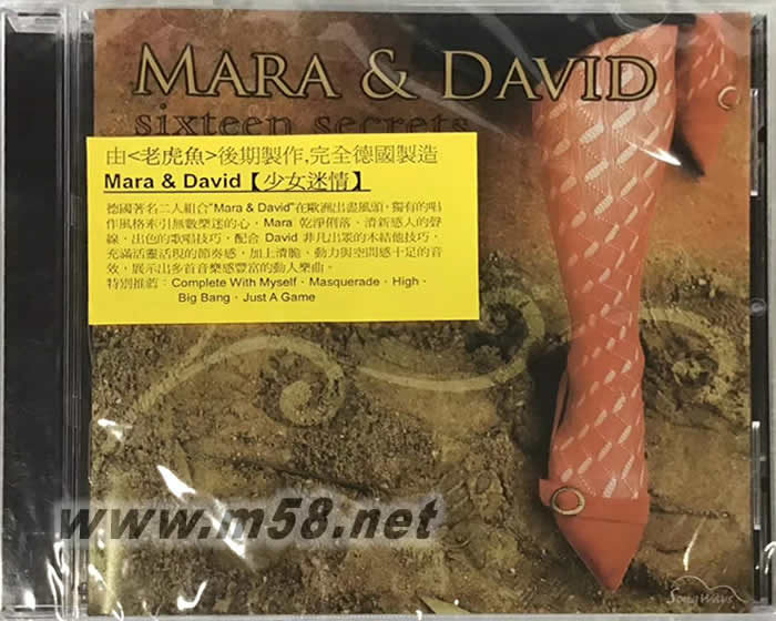 SIXTEEN SECRETS 少女迷情 (老虎魚)(m58.net) 由<老虎魚>后期制作.完全德國制造 Mara & David 少女情迷 德國著名二人組合"mara & david" 在歐洲出盡風(fēng)頭.獨有的唱作風(fēng)格牽引無數(shù)樂迷的心.mara 干凈利落,清新感人的聲線.出色的歌唱技巧,配合david非凡出眾的木吉它技巧.充滿活靈活現(xiàn)的節(jié)奏感.加上清脆.動力與空間感十足的音效.展示出多首音樂感豐富的動人樂曲. 特別薦:complete with myself,masquerade.high, big bang.just