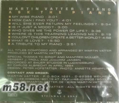 ASK THE PIANO黑鋼琴(m58.net) MASTERING BY PAULER ACOUSTICS Martin Vatter (馬丁瓦特) 把鋼琴融合在心,體驗出音樂的浪漫與激情,反射出他高度個人主義,強而有力之鋼音,多樣化的音樂元素像是靈魂的肉欲。 Ask The Piano(黑鋼琴)在德國西南部之路德威茲堡Bauer Studios包爾錄音室收錄,這是世界知曉之大錄音室,使用Neumann tube-microphone SM 69把美麗浪漫的60 年古董Steinway大三角model D鋼琴聲音完完全全記錄下來,錄音師Carlos Albrecht在發燒音樂界響徹云霄,他曾為Philip Glass、John McLanghlin Trio、John Pastorius、Bobby McFerrin及Ray Brown監製與錄下相當多之著名專輯。想要浪漫幻想鋼琴加完美之發燒音效…Ask The Piano 問問黑鋼琴?
