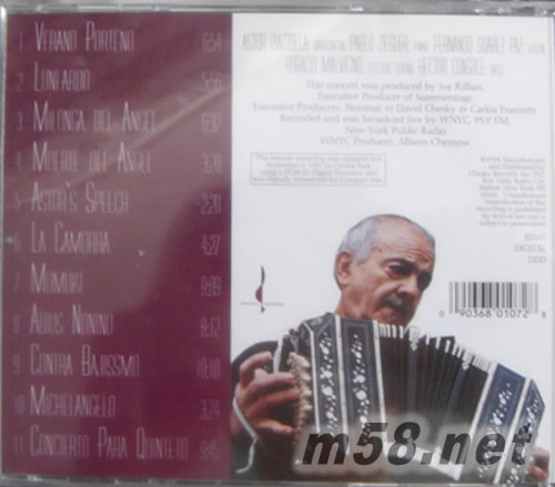 Astor Piazzolla: The Central Park Concert(m58.net) Astor Piazzolla(1921—1992)阿根廷探戈之父.現(xiàn)代探戈作曲家及阿根廷式手風(fēng)琴手。他將爵士樂(lè)中的精神 - 即興演奏,以另一種面貌及音響表現(xiàn)出來(lái)。他的樂(lè)曲主要以探戈獨(dú)有的辛辣節(jié)奏所帶動(dòng)的反覆音形段落,以及旋律連綿不絕的抒情段落所組成 by Astor Piazzolla This powerful concert was recorded live in New York City on September 6, 1987. Piazzolla was playing with his best ensemble: a quintet consisting of himself on bandoneon, Pablo Ziegler on piano, Fernando Suarez Paz on violin, Horacio Malvicino on electric guitar, and Hector Console on bass. Piazzolla plays some of his finest material -- about half of Tango: Zero Hour surfaces, for example. Two of the most paradigmatic Piazzolla pieces show up too: "La Camorra," with its alternating moments of tense dance rhythms and creepy atmosphere, and "Verano Porteño," with its dancing-bear rhythms. The concert closes with "Concierto Para Quinteto," one of those long pieces that Piazzolla favored that visits many styles and moods -- almost many eras. It would be very easy to lose the thread on such an epic composition in live performance, but the quintet keeps it together admirably. The live recording is of surprisingly high quality; there is an appropriate echo and the balance is nearly perfect. The audience is completely unobtrusive -- inaudible except when they applaud. And the instruments are very clear, especially when the musicians coax those "zings" and "pops" out of them that Piazzolla loved. For someone new to his work, the "special effects" on this recording can be a revelation. There is also a wonderful spoken track, with Piazzolla talking about himself, the tango, and the mysterious bandoneon. This album is a wonderful place to start -- or finish -- with this charismatic composer of nuevo tango music. ~ Kurt Keefner, Rovi Hide