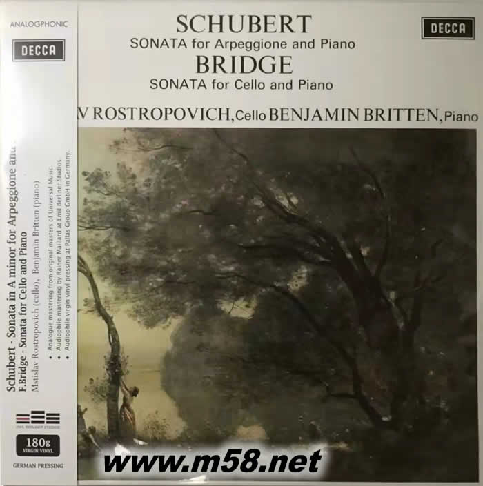 舒伯特:阿貝鳩奈奏鳴曲 ; 布瑞基:大提琴奏鳴曲SCHUBERT SONATA FOR ARPEGGIONE AND PIANO BRIDGE 大提琴與鋼琴 黑膠(m58.net) 原始母盤交由 DG 資深錄音工程師 Rainer Maillard 負責黑膠母帶后期處理 ★ 德國最具歷史與傳統的 Emil Berliner Studios 刻錄黑膠母盤 ★ 德國黑膠壓片廠 Pallas GmbH 壓製 180g 高品質黑膠唱片 演出者: Mstislav Rostropovich (大提琴) Benjamin Britten (鋼琴)