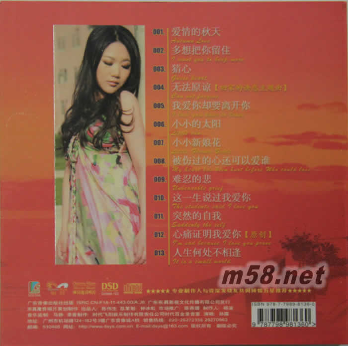 01 愛(ài)情的秋天 02 多想把你留住 03 猜心 04 無(wú)法原諒(回家的誘惑主題曲) 05 我愛(ài)你卻要離開(kāi)你 06 小小的太陽(yáng) 07 小小新娘花 08 被傷過(guò)的心還可以愛(ài)誰(shuí) 09 難忍的悲 10 這一生說(shuō)過(guò)我愛(ài)你 11 突然的自我 12 心痛證明我愛(ài)你(原創(chuàng)) 13 人生何處不相逢