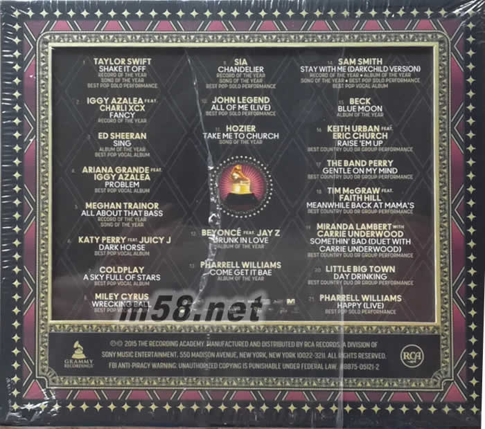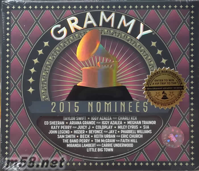 2015 葛萊美GRAMMY® Nominees(美版)(m58.net) 2015格林美官方大碟”2015 GRAMMY® Nominees”. 精彩輯錄21首大熱提名歌曲. 收錄歌手包括 Taylor Swift, Ed Sheeran, Ariana Grande, Meghan Trainor, Coldplay, Sia 及Pharrell. 全部都是去年樂(lè)壇最熱的名字, 曲目有史以來(lái)最強(qiáng), 歌迷不容錯(cuò)過(guò)!