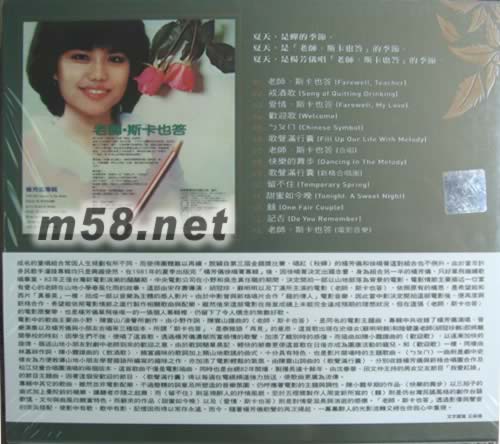 楊芳儀 老師 斯卡也答(永遠的未央歌)(m58.net) 「斯卡也答」,泰雅族語「再見」的意思。由胡冠珍,蘇明明以及丁漢所主演的電影〈老師,斯卡也答〉,片中歌曲均收錄在這張電影原聲帶。透過「秋蟬」主唱人楊芳儀真摯深刻的詮釋,格外引人共鳴。特別是小朋友們與楊芳儀合唱的主題曲〈老師,斯卡也答〉,洋溢依依不舍之情,令人動容。 <詳細介紹>電影中的歌曲主要由小野、陳云山/凌譽所創作。由小野作詞,陳云山譜曲的〈老師,斯卡也答〉,是同名的電影主題曲,專輯中共收錄了楊芳儀演唱、音樂演奏以及楊芳儀與小朋友合唱等三種版本。這首歌出現在史修女(蘇明明飾)和陸碧蓮老師(胡冠珍飾)即將離開學校的時刻,因學生們不舍,便唱了這首歌。透過楊芳儀濃郁而富感情的歌聲,加添了離別時的感傷。而插曲如陳小霞譜曲的〈歡迎歌〉,描述山地小朋友對劇中老師到來的歡迎之意。由於歌詞簡單易記,輕快的節奏更使這首歌在日後亦成為團康活動的寵兒。和〈歡迎歌〉一樣,同樣由林嘉祥作詞,陳小霞譜曲的〈飲酒歌〉,饒富趣味的歌詞加上類山地歌謠的曲式,十分具有特色,也是影片開場時的主題歌曲。〈ㄅㄆㄇ〉一曲則是劇中史修女為方便教導山地小朋友學習國語所編寫的趣味之作,亦加添了電影輕松的氣氛。由陳云山詞曲的〈歌聲滿行囊〉,分別收錄楊芳儀與新格合唱團合作及松江兒童合唱團演唱的兩個版本。這首歌同時也是臺視制播長達十馀年,由沈春華、田文仲主持的男女交友節目「我愛紅娘」的節目主題曲。因著這個受歡迎的節目,〈歌聲滿行囊〉得以每周在電視頻道強力放送,使歌曲更廣為流傳。 至於五燈獎制作人周宜新所寫的〈 〉則是仿臺灣民謠風格的創作臺語歌謠。而蘇來的作品〈甜蜜如今晚〉以及〈愛情,斯卡也答〉則是對情愛滋長與消逝的感懷。「老師,斯卡也答」透過影像與聲音的完美搭配,使影中有歌,歌中有影,記憶因而得以常存永遠。而今,隨著楊芳儀歌聲的再次揚起,一幕幕醉人的光影流轉又將在你我心中重現。