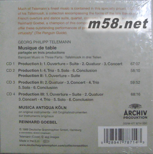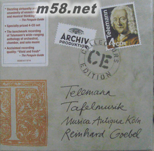 價格為估,以實到貨為準! Telemann:Tafelmusik泰雷曼 巴洛克時期宴席音樂(m58.net) ☉戈貝爾指揮 / 柯隆古樂團 「宴席音樂」是十六、十七世紀歐洲特有的一種音樂型式,用途是在宴會、戶外活動時,當成背景音樂使用,當時許多作曲家都創作有「宴席音樂」。而在巴洛克時期的「宴席音樂」里,泰雷曼的作品公認是最受歡迎,至今,幾乎「泰雷曼」與「宴席音樂」已經成了同義詞。泰雷曼是一位多產的作曲家。在他為數眾多的作品里,又以協奏曲為最大宗。雖然在有生之年里,泰雷曼因為率先密切結合音樂商業,甚至在自己的樂譜印上廣告詞而迭遭衛道人士指責批評,但是,他們都無法否定泰雷曼作品中流暢嫻熟的技巧與音樂的魅力。 在戈貝爾與柯隆古樂團的錄音里,泰雷曼一直佔有極重要的份量。由於柯隆古樂團的音樂家素質非常高,演奏效果自然非同一般。他們帶給泰雷曼的作品生動迷人的活力,但是又不會顯得浮夸,並且刻畫樂曲的結構與對比性及豐富度。