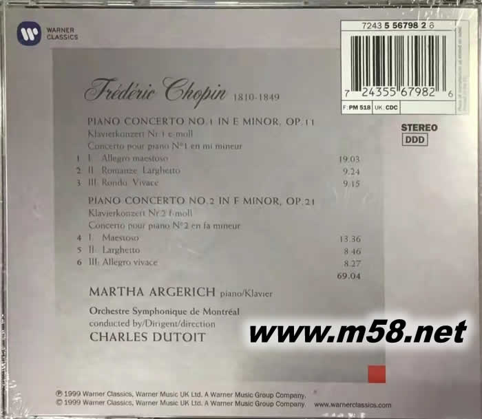 蕭邦:第1,2 鋼琴協奏曲 Chopin: Piano Concertos Nos. 1 & 2(m58.net) 弗雷德里克·肖邦(Frederic Chopin 1810~1849)對鋼琴情有獨鐘,用情之深遠勝于音樂史上任何作曲家,甚至深到不愿為其他樂器(包括管弦樂團)作曲的地步。肖邦竭力為鋼琴獨奏曲的技巧和形式開辟新天地,但在寫作鋼琴以外的音樂時,他依然遵循傳統形式。他在創作這兩首鋼琴協奏曲時,就是遵循傳統,參照胡梅爾(Johann Nepomuk Hummel) 的協奏曲為圭臬(當時他還未接觸莫扎特和貝多芬的鋼琴協奏曲). 肖邦寫下兩首鋼琴協奏曲之后,便離開波蘭,踏上了漫游歐洲的旅程,獲得當時音樂界泰山北斗的地位。他從此再也沒有回過波蘭,這對波蘭來說是一大損失,但對巴黎而言卻是一大收獲。肖邦在他人生的最后二十年里,雖然感情生活波讕不斷,而且有病在身,卻為鋼琴創作出許多不朽名曲,無論是作品的詩意,還是對鋼琴表現能力的敏銳探索,在音樂史上都無與倫比。 《f小調鋼琴協奏曲,Op.21》寫作時較早,但因出版時間較晚,所以編號為第二號。此曲證明了肖邦音樂寄托之所在:以抒情的稍緩板為中心,所有重要的音樂內容都由鋼琴娓娓道來,而首尾樂章也提供鋼琴一連串機會,進一步深入詮釋管弦樂團表達的許多樂念。即使第一樂章開頭的管弦樂齊奏潛藏著一種陰沉的情緒,鋼琴部分卻有著狂想式的璀璨風格,避免深陷在悲郁的情調里,反而能使聽眾振奮起來。稍緩板樂章帶有升華的、近似逃避主義的、夢幻般的感覺。一開始有如夜曲,戲劇性的中段突然迸發出強大的熱情,而后又悠然隱退,最后以如夢似幻般的手法收尾。肖邦曾私下透露,這首樂曲事實上是源自一段美麗戀情的回憶,女主角是他音樂學院女同學葛萊寇絲卡(Konstancja Gladkowska),她在當時也是一位出色的年輕女歌唱家。終樂章是充滿活力的回旋曲(Kujawiak,鋼琴不斷地以八分音符三連音的流暢樂段主導管弦樂的進行)。此曲1830年3月17日在華沙國家歌劇院首演,而肖邦本人于1832年的春天在巴黎普雷耶廳(Salle pleyel)首度登臺時,也是演奏這部作品。 《e小調鋼琴協奏曲,Op.11》的模式總體上和《f小調協奏曲》相同:開闊的第一樂章以陰暗、急迫的管弦樂合奏開場,由于詠嘆調般的第二主題而在瞬間緩和下來。當鋼琴以冥想式的曲風加入后,管弦樂團立刻在進一步的樂曲發展中退居從屬地位。獨奏部分顯得散漫而無層次,但卻極富想像力,并且由于對第二主題熱力四射的處理方式,顯得格外搶眼。此曲也是以第二樂章為中心,其中的《浪漫曲》或許又是受葛萊寇絲卡的激發而作,肖邦賦于她“一種浪漫、沉靜、略帶憂郁的特質”。先是一小段管弦樂序奏,然后鋼琴奏出一首夜曲般的旋律,并延伸出一段狂想曲。終樂章一開始頗有斯拉夫民族的感情色彩,一部分原因是肖邦善于冶煉多樣化的調性和聲。獨奏部分既結合了練習曲的活力,也具備迷人的優雅特質,最后奏出一段技藝高超的終曲。此曲1830年10月11日在肖邦告別華沙的音樂會上進行了首演。 迪圖瓦指揮的蒙特利爾交響樂團有分量十足、氣勢堂皇的演出。但第一鋼協一開頭的管弦樂的演奏顯得有些臃腫和不干凈,使人懷疑這張唱片獲獎的成色('99 Gramophone 最佳協奏曲唱片),然而當阿格里奇獨奏一出來,所有的疑慮便一掃而光了。這是一個仍然處于巔蜂狀態的瑪爾塔。她的演奏依然熱情如火,并很好地結合了作品的抒情性與高超的技巧,使得兩首協奏曲中一些平淡乏味的樂段增添了色彩與生氣。清晰明亮的琴聲把節奏自由的抒情片段表現得盡善盡美。或許會有人覺得阿格里奇的演奏太過于獨特,不能反復地聽個不停。但無論如何,她的演奏絲毫沒有“例行公事”的痕跡。鋼琴發出的聲音令人難忘,忠誠地傳達了演奏家即興發揮的意愿。阿格里奇技藝已經步入了“自由王國”的境界,即使不是肖邦迷,也應該聽聽這張唱片。