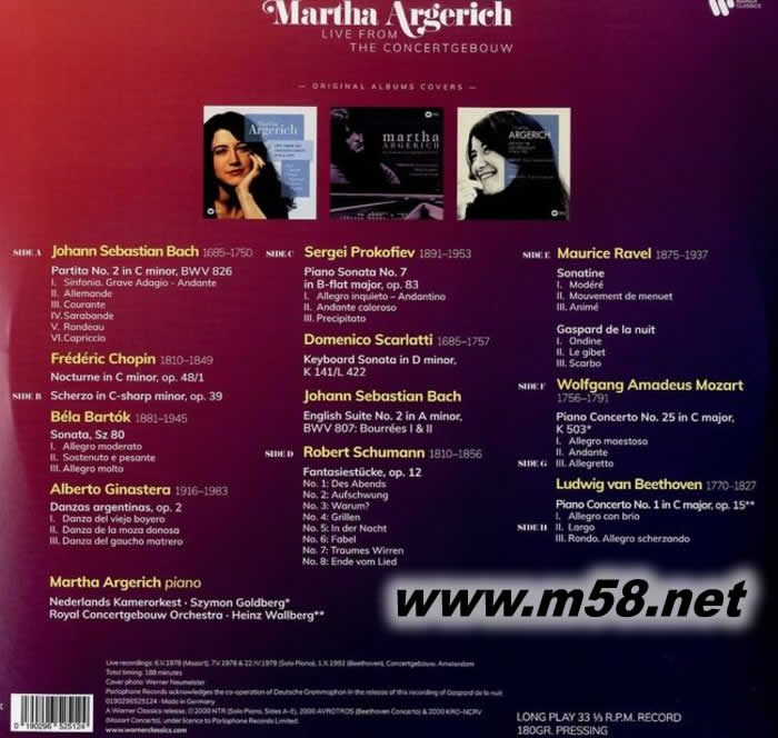 SIDE A 巴哈:C小調第二號組曲,BWV 826 蕭邦:C小調第十三號夜曲,作品48-1 SIDE B 蕭邦:升C小調第三號詼諧曲,作品39 巴爾托克:鋼琴奏鳴曲,Sz.80 希納斯特拉:阿根廷舞曲,作品2 SIDE C 普羅高菲夫:降B大調第七號鋼琴奏鳴曲,作品83 史卡拉第:D小調鋼琴奏鳴曲,K. 141 巴哈:布雷舞曲(A小調第二號英國組曲,BWV 807) 《鋼琴小品集-1978/79阿姆斯特丹皇家大會堂現場錄音》 SIDE D 舒曼:幻想小品,作品12 SIDE E 拉威爾:小奏鳴曲 拉威爾:夜的加斯巴 SIDE F & SIDE G & SIDE H 莫札特:C大調第二十五號鋼琴協奏曲,K. 503 戈德堡〈指揮〉荷蘭室內樂團 貝多芬:C大調第一號鋼琴協奏曲,作品15 沃爾堡〈指揮〉皇家大會堂管絃樂團