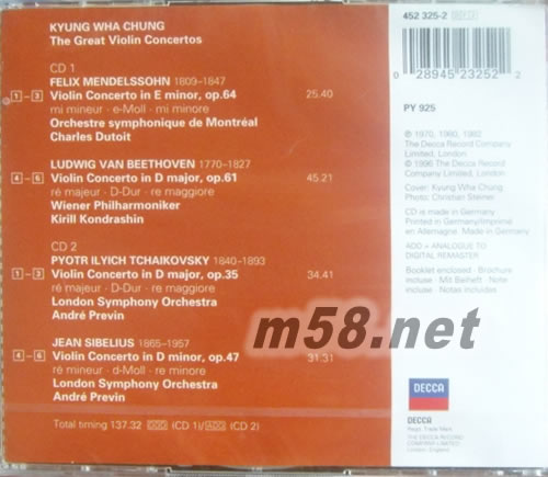 偉大的小提琴協(xié)奏曲MENDELSSOHN/BEETHOVEN(古典愛好者必備)(m58.net) 鄭京和1948年3月26日出生在韓國(guó)的漢城,受父母喜愛音樂的影響,她從事了音樂演奏,在鄭京和求學(xué)的道路上她有幸得到本世紀(jì)的幾位名家的指點(diǎn),她的琴藝突飛猛進(jìn)。1967年,19歲的鄭京和與18歲的同門師弟祖克曼參加了著名的萊文垂特國(guó)際小提琴比賽,在這次比賽中她力克群雄,以優(yōu)異的成績(jī)奪得第一名,祖克曼與其并列。當(dāng)比賽結(jié)束,評(píng)委們?cè)谛极@獎(jiǎng)?wù)叩拿麊螘r(shí),早已緊張到極點(diǎn)的祖克曼在聽到自己獲得了本次比賽的第一名時(shí)不禁喜極而泣,而另一位第一名的獲得者鄭京和卻蹤影全無。當(dāng)急壞了的人們?cè)谝粋€(gè)角落里找到她時(shí),卻發(fā)現(xiàn)鄭京和早在那里進(jìn)入了夢(mèng)鄉(xiāng)。比賽結(jié)束后有評(píng)論家在報(bào)紙上這樣對(duì)鄭京和的演奏評(píng)論道:“在絕大多數(shù)十八九歲的青年演奏家還停留在展示技巧的時(shí)候,鄭京和卻早已善于將自己的人格魅力融入在了她所要演奏的音樂之中。”自這次比賽之后鄭京和的名聲大振,此后她巡演于全世界。鄭京和的演繹被一些音樂評(píng)論家認(rèn)為“演奏有精確的節(jié)奏感,透明清純的音質(zhì),感情非常豐滿,美妙的抒情味能滲入作品的深處”。 小提琴協(xié)奏曲數(shù)量如此稀少,以至于頂尖的獨(dú)奏者不得不反復(fù)排練貝多芬《D大調(diào)小提琴協(xié)奏曲》、門德爾松《e小調(diào)小提琴協(xié)奏曲》、柴可夫斯基《D大調(diào)小提琴協(xié)奏曲》、勃拉姆斯《D大調(diào)小提琴協(xié)奏曲》四部作品,這使獨(dú)奏者在頻繁的演出生涯中要避免作品乏味變得很不容易。但是鄭京和在這點(diǎn)上顯然比大多數(shù)演奏者都成功,她曾說:“每一次的演出都能給我?guī)硪恍┬碌撵`感,如果不是這樣我將變得一無所有。” Decca這套雙CD已經(jīng)將這位當(dāng)代杰出女小提琴家在該公司灌錄的重要小提琴協(xié)奏曲一網(wǎng)打盡,共計(jì)收入貝多芬《D大調(diào)小提琴協(xié)奏曲》、門德爾松《e小調(diào)小提琴協(xié)奏曲》、柴可夫斯基《D大調(diào)小提琴協(xié)奏曲》、西貝柳斯《小提琴協(xié)奏曲》四部作品,擔(dān)任協(xié)奏的樂團(tuán)和指揮家也都是一時(shí)之