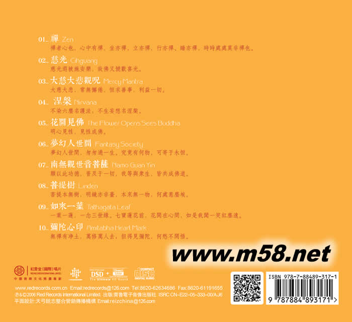 01 禪 Zen 02 慈光 Tsukuang 03 大慈大悲觀咒 Merciful concept curse 04 涅盤 Nirvana 05 花開見佛 Flowers Xianfo 06 夢幻人世間 Dream on earth 07 南無觀世音菩薩 Namo Avalokiteshvara 08 菩提樹 Linden 09 如來一葉 Tathagata a leaf 10 彌陀心印 Amitabha heart India