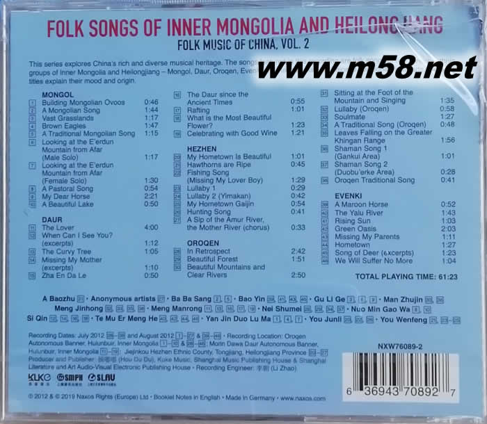 中國民歌集 (2) 內蒙古與黑龍江 蒙古族、赫哲族、達斡爾族、鄂倫春族、鄂溫克族民歌 FOLK MUSIC OF CHINA VOL.2 FOLK SINGS OF INNER MONGOLIA AND HEILINGJIANG(m58.net) 本系列探討中國豐富多樣的音樂遺產。本次錄制的歌曲是內蒙古、黑龍江五個少數民族的民歌——蒙古族、達斡爾族、鄂倫春族、鄂溫克族、赫哲族。與中國傳統視覺藝術一樣,歌名解釋了它們的意境和起源。