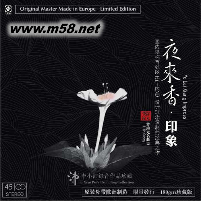 夜來(lái)香·印象 黎錦光名曲集 45轉(zhuǎn) 黑膠(m58.net) 歌曲《夜來(lái)香》改編成無(wú)伴奏混聲合唱版本,聲部分明,人聲動(dòng)態(tài)清晰飽滿(mǎn);《哪個(gè)不多情》打動(dòng)人心,演唱者劉琳是黎錦光的外孫女,錄音人聲的定位真實(shí)悅耳,體現(xiàn)出錄音大師李小沛的高超水平;《滿(mǎn)場(chǎng)飛》充滿(mǎn)倫巴舞曲的節(jié)奏,仿若將人帶回?zé)艏t酒綠的老上海...同時(shí),上世紀(jì)30年代戲劇文化開(kāi)始蓬勃發(fā)展,音樂(lè)家黎錦光先生也為眾多電影提供歌曲,如為“華影”所拍攝電影《紅樓夢(mèng)》而作的《葬花》主奏二胡的是民樂(lè)大師明源先生,為戰(zhàn)后香港的一部國(guó)語(yǔ)電影《燕燕于飛》所作插曲《黃葉舞秋風(fēng)》,著名老電影《天涯歌女》插曲《襟上一朵花》等作品,將歌曲改編成純器樂(lè)曲,不失原作特點(diǎn)的同時(shí)畫(huà)面感極強(qiáng);同時(shí)富有濃厚鄉(xiāng)土情懷的《采檳榔》、《四季青》等根據(jù)民間小調(diào)所創(chuàng)作的作品,在編配時(shí)也遵循作曲家黎錦光先生的創(chuàng)作風(fēng)格來(lái)演繹。