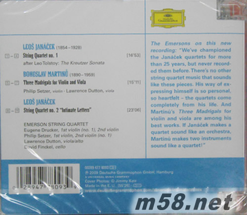 楊納杰克:第一&二號弦樂四重奏Janacek:String Quartet No.1(m58.net) 楊納杰克的文學造詣可謂非常深厚,他曾經根據奧斯特洛夫斯基的戲劇《大雷雨》、杜斯妥耶夫斯基小說《死屋手記》譜成歌劇《卡嘉‧卡巴諾娃》與《死屋手記》,而第一號弦樂四重奏的創作靈感就是來自列夫‧托爾斯泰的小說《克羅采奏鳴曲》。楊納杰克非常喜愛以音樂來描寫女人,在寫給晚年愛慕的女性卡蜜拉的信里,楊納杰克就提到這首作品是描寫《克羅采奏鳴曲》那些被丈夫當成奴隸的妻子;而第二號弦樂四重奏《心言》表現的,正是楊納杰克對卡蜜拉愛意。 約莫在1930年代早期,德國作曲家馬替努對於巴洛克時期的大協奏曲曲式產生濃厚的興趣,並且以仿大協奏曲風格為獨奏樂器創作。接著馬替努的興趣又移轉到十四世紀的牧歌。一般人對於牧歌的印象一直停留在聲樂曲上,但是到了巴洛克時期,牧歌的意義擴展到泛指任何世俗復音音樂,包括聲樂曲與器樂曲。馬替努的作品里,以「牧歌」為名的,至少就有二十首。馬替努創作這一套三首,為小提琴與中提琴所寫的牧歌(又稱為第一號二重奏)時,他因為從十英尺高的地方跌落水泥地,頭骨摔破而被迫靜養。病榻上的馬替努專注於室內樂創作,特別是當時最沉迷的弦樂作品,因此這三首以奏鳴曲式寫成的牧歌的弦樂技巧並不容易,規模也不小。 艾默森弦樂四重奏是一個理性而且具有高度默契與演奏技巧的團體。溫暖的音色中仍時時透露著明晰亮麗的美式美感與強烈的熱情,以及對於音樂的強烈共鳴。創團之初,楊納杰克兩部弦樂四重奏就是該團最常演出的曲目之一,艾默森弦樂四重奏以極其細膩的方式演奏,精致地描繪出屬於楊納杰克內心的聲音色彩。
