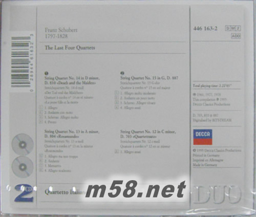 CD1 String Quartet No.14 in D minor,D.810 01.Allegro 02.Andante con moto 03.Scherzo.Allegro molto 04.Presto 0tring Quartet No.13 in A minor,D.804 05.Allegro ma non troppo 06.Andante 07.Menuetto 08.Allegro moderato CD2 String Quarte No.15 in G,D.887 01.Allegro molto moderato 02.Andante un poco moto 03.Seherzo.Allegro vivace 04.Allegro assai String Quartet No.12 in C minor,D.703 05.Allegro assai