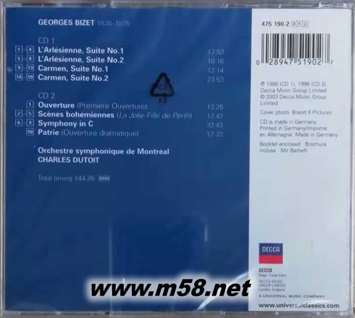 查爾斯·迪圖瓦 - 比才:阿萊城姑娘組曲 & 卡門組曲 CARMEN SUITES SYNPHONY IN C 雙CD(m58.net) 喬治?比才(Georges Bizet,1838-1875),法國作曲家,生于巴黎,世界上演率最高的歌劇《卡門》的作者。九歲起即入巴黎音樂學院學習作曲,后到羅馬進修三年。1863年寫成第一部歌劇《采珍珠者》。1870年新婚不久參加國民自衛軍,后終生在塞納河畔的布基伐爾從事寫作。在他的戲劇配樂《阿萊城姑娘》和《卡門》等九部歌劇作品中,體現了濃厚的現實主義色彩,社會底層的平民小人物成為作品的主角。在音樂中比才把鮮明的民族色彩,富有表現力的描繪生活沖突的交響發展,以及法國的喜歌劇傳統的表現手法熔于一爐,創造了十九世紀法國歌劇的最高成就。 《阿萊城姑娘》(L'Arlésienne)是比才膾炙人口的作品。1872年夏天,法國沃德維爾劇院經理邀請比才為即將在他的劇院里上演的話劇《阿萊城姑娘》寫戲劇配樂,他在很短的時間里為話劇《阿萊城姑娘》寫了27段音樂。 同年10月1日,話劇《阿萊城姑娘》上演了,戲劇沒有獲得成功,可是音樂卻受到觀眾好評。后來這部話劇很少演出,比才就從中選了4段音樂編成管弦樂《阿萊城姑娘》組曲,演出后受到熱烈歡迎。這首具有法蘭西風格并糅和了西班牙情調的田園詩,曾經被人這樣評價過:“它洋溢著作者心中的夢幻,形式純樸自由,音調悠揚高雅,像慈母的微笑,像潔白的愛情的結晶,提琴部分的香氣在弦線上散發出來,溫柔的淚珠滾流著”。 這款由查爾斯?迪圖瓦(Charles Dutoit)指揮蒙特利爾交響樂團演出灌錄的《比才:阿萊城姑娘組曲 & 卡門組曲》,是演錄俱佳的天碟表率。