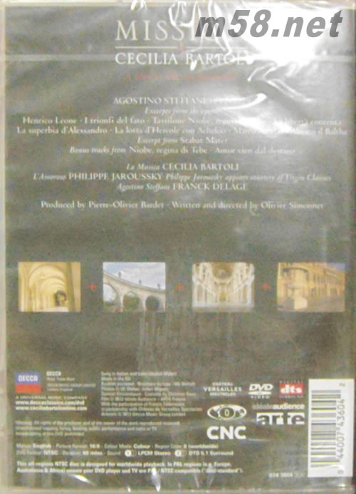 Mission DVD(m58.net) 這份光碟收錄了在「任務」CD中沒有收錄的五首詠嘆調,光碟中,芭托莉親自前往凡爾賽宮,重現1679年時,史戴法尼(Agostino Steffani)以二十五歲之齡在太陽王路易十四面前獻樂時的景像。影片中我們還能看到法索利斯帶領他的巴洛克古樂團為她伴奏,另外法國假聲男高音雅洛斯基也特別粉墨登場,在二重唱中與芭托莉共同演出。 闊別三年未出新輯,2012年芭托莉再次透過深入的研究與音樂考古,終於再次推出新作。這次她所挖掘出的,是一套全新的迷人巴洛克作品,介紹我們一位被音樂界全然忽略的作曲家:史戴法尼(Agostino Steffani)。他是義大利巴洛克中葉的歌劇作曲家,因為從小擁有優美歌聲而成為威尼斯圣馬可教堂的詩班員,並進一步被巴伐利亞選侯爵相中全力栽培,把他帶到慕尼黑訓練(當時威尼斯作曲家都是在義大利訓練出身),之后回到羅馬繼續接受指導,並成為神父,且開始醉心歌劇創作,他的這些作品對當時歌劇有很大的影響。 接著他被漢諾威宮廷樂團聘用,在此和哲學家萊布尼茲交好,后來因為漢諾威選侯爵成為英皇喬治一世,很多作品就跟著被帶到英國,所以至今都保留在白金漢宮中,但史戴法尼和繼任的漢諾威爵爺關係不佳,因此被派成駐外使節。但他盡心的外交工作,卻意外贏得教皇無瑕十一世的肯定,封他為樞機主教,其后不斷被高升,但仍然能在如此繁重的外交工作中,擠出時間來創作。另外史戴法尼也寫了上百首的二重唱清唱劇,這些作品的旋律皆可愛迷人,也預表了莫札特歌劇詠嘆調的風格。而他的器樂作品則透露出韓德爾曾受其影響,因他在韓德爾事業初期曾給予協助。 這張專輯是以史戴法尼一生周游歐洲出使任務一事作為主題,追蹤他在各地所留下的聲樂作品。片中芭托莉刻意挑選了多首世界首度錄音的作品,並請來法國首席假聲男高音,音域能直達女高音的賈洛斯基與她合唱史戴法尼最為人津津樂道的二重唱清唱劇。