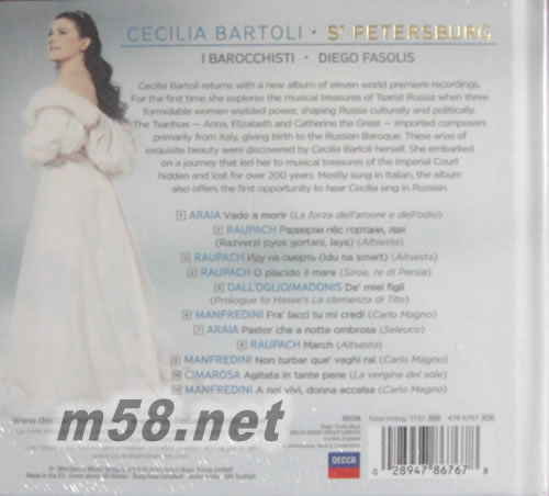 ST PETERSBURG 圣彼得堡 限量豪華歐版(m58.net) 二十一世紀(jì)最偉大的次女高音芭托莉,在2014推出的輝煌年度鉅作 - 《圣彼得堡》,不負(fù)眾人期望,一如歷來她所出版的每一張專輯,為樂迷帶來又一次全新的體驗。專輯中所有的歌曲均來自俄國圣彼得堡馬林斯基劇院的珍藏樂譜,芭托莉不但挖掘出該劇院獨有的巴洛克音樂寶藏,也再次展示了這位藝術(shù)家令人稱奇的獨特演唱才華。 近年來芭托莉不斷專研並發(fā)掘許多精彩且罕見的作品,陸續(xù)發(fā)表了許多世界首度錄音的專輯,如《美聲奉獻(xiàn)》(Sacrificium)、《禁忌的歌劇》(Opera Proibita)、《任務(wù)》(Mission),以及最新專輯《圣彼得堡》(St Petersburg)等。對於最能夠展現(xiàn)其聲音特色的巴洛克音樂與古樂,芭托莉特別感興趣,而這些作品正是其當(dāng)前音樂藝術(shù)核心之所在。 十八世紀(jì)沙俄時代,三位女沙皇:安娜(Anna Ioannovna,在位期間:1730–40)、伊莉莎白(Elizaveta Petrovna,在位期間:1741–62)與凱薩琳(二世)大帝(Catherine II,在位期間:1762–96),為了提升俄國的文化層次,邀請了來自義大利的著名作曲家為俄國宮廷創(chuàng)作;包括:阿萊亞(Francesco Araia, 1735–59)、勞帕赫(Hermann Friedrich Raupach, 1759–61)、曼佛雷迪尼(Vincenzo Manfredini, 1761–63)以及祁馬羅沙(Domenico Cimarosa, 1787–91)等人。芭托莉首度探索這些被埋藏在圣彼得堡馬林斯基圖書館長達(dá)兩百年的作品,並親自仔細(xì)研究,為樂迷揭示一段令人難以置信的歷史時光:一個讓俄羅斯政治與文化走向開明的西化過程。 專輯中大部分樂曲是以義大利文演唱,其中也有少數(shù)俄文歌曲,而這也是芭托莉首度以俄文演唱。指揮法索利斯(Diego Fasolis)同時也是一位巴洛克音樂專家,由他帶領(lǐng)巴洛克人古樂團(tuán)(I Barrochisti)繼《任務(wù)》專輯之后,與芭托莉再度合作。優(yōu)異的演唱與精彩的演奏,為樂迷帶來專屬俄國宮廷、既古老又新鮮、一場璀燦無比的巴洛克音樂饗宴。