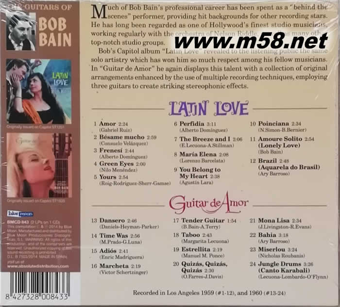 拉丁之愛 西班牙吉它 Latin Love + Guitar De Amor HIFI 音響推介(m58.net) 他的名字可能不太熟悉,但雅致的吉他風格,征服數以百萬計的心。Bob Bain (鮑勃。貝恩)奠定了自我的風格,一個自然的,旋律優美的聲音。這張二合一專輯2LPs on 1CD,純吉他演奏,兩張著名作品,包括柔情似水之Latin Love及西班牙味十足之Guitar De Amor