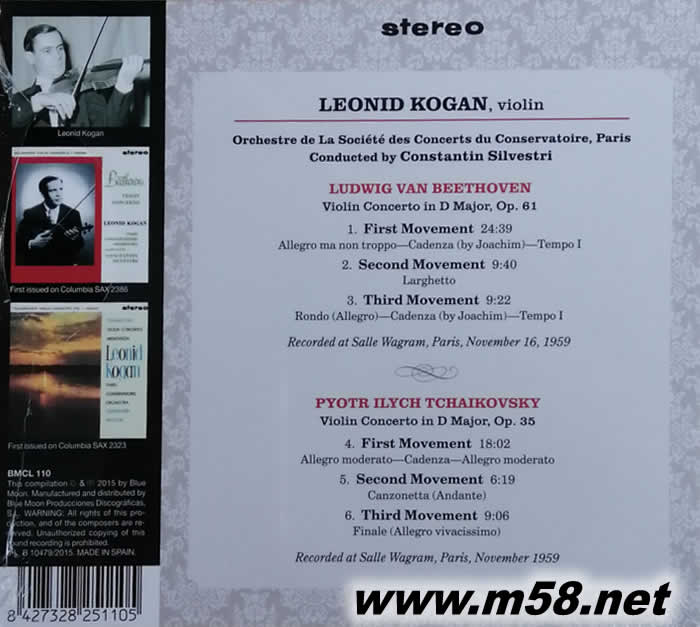 BEETHOVEN & TCHAIKOVSKY: VIOLIN CONCERTOS(m58.net) Leonid Kogan (柯岡) 鼎鼎大名之俄國小提琴家,Blue Moon 以最廣為人知;原汁原味的方式加最精湛的mastering技術(shù),把其同時(shí)在1959年11月法國巴黎Salle Wagram完成錄音的兩個(gè)作品,Beethoven及Tchaikovsky 小提琴協(xié)奏曲以二合一推出??聦詿o比快速的手法加上粗獷飽滿的音色而聞名,自他在火車上離奇的心臟病發(fā)后,他留傳下來之詮釋作品即成為經(jīng)典??聦怎r明的演奏風(fēng)格演出Beethoven小提琴協(xié)奏曲,壯麗輝煌,像有用不完的活力,斷句明快有力。Tchaikovsky完全展現(xiàn)出其個(gè)人風(fēng)格,就像是對全世界彈奏出此曲的深刻見解,氣勢一時(shí)無兩;大開大合,表現(xiàn)霸氣! HI FI REVIEW (2015/8/1) Author: Megan Leonid Kogan Leonid Kogan《貝多芬/柴可夫斯基小提琴協(xié)奏曲》均是在1959年的靚錄音,如今兩張?jiān)鍸P已被炒至天價(jià)!我早就買下日本東芝EMI在1991年推出的Kogan《柴協(xié)》。已覺錄音甚佳。近年Kogan《貝協(xié)》和《柴協(xié)》黑膠華麗再版,再次引起發(fā)燒友的關(guān)注。若你沒有黑膠唱盤,又或覺得再版黑膠不夠經(jīng)濟(jì),那這合二為一的Blue Moon CD絕對是無敵best Buy! 若說Blue Moon在Belafonte的處理上帶有放任主意,那么,對Kogan CD的處理就來得較正經(jīng)謹(jǐn)慎、四平八穩(wěn)。明顯地,Blue Moon要比日版更開揚(yáng)奔放、透明清晰,小提琴更高、更聚更生動,音場更闊大深后,分隔度更佳! CNA music的廣告:「原裝母盤處理,原汁原味不浮不躁,盡顯模擬錄音本色」。聽過近年Blue Moon製版經(jīng)典靚錄音CD的發(fā)燒友都會知道,其聲音訊息量是多得驚人的,尤其是中頻和高頻,堂音特別多。音場特別闊大高深,所用的母帶當(dāng)然靚極,絕非dup過又dup的N代copy。我已收藏了十款以上的Blue Moon製版舊錄音,覺得其中頻和高頻訊息量最多,是發(fā)燒友的必然期望!今次在Belafonte和Kogan的CD上亦再一次得到印證。 不只一位唱片評論員講過Blue Moon CD的聲音非常analog,有同感。我的同感在於Blue Moon CD那些豐富無比的弱音細(xì)節(jié),悠長的余響,巨大的空間感,高速的動態(tài),順暢的變化,活靈活現(xiàn)的音響表情,是追得非常接近優(yōu)質(zhì)黑膠唱片了!至於音色。我會用甜絲絲、濕滑暖潤的優(yōu)質(zhì)真空管擴(kuò)音機(jī)聲音來形容優(yōu)質(zhì)黑膠唱片的聲音效果。至於Blue Moon CD,就是當(dāng)世最清通光潔的頂級晶體管擴(kuò)音機(jī);這份極至音效,我們可在這兩張CD上感受得到。