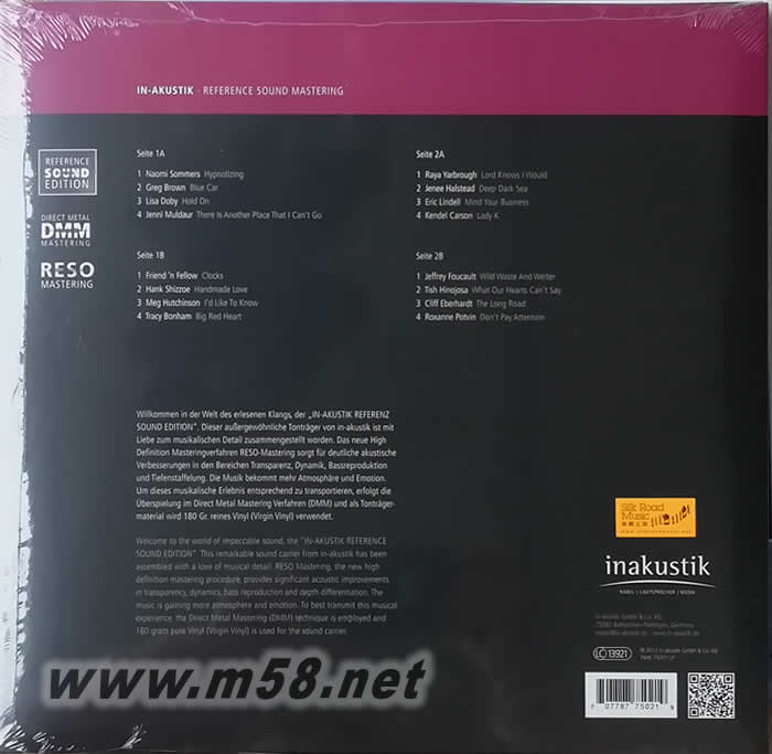音源對比母盤制作(RESO Mastering – Reference Sound Mastering)是採用現今最高解像度技術使原母盤內的音源效果得以改良和提升,清澈度更高,動態范圍更寬,低頻更重更深,是音響發燒友夢寐以求的音效。這種新制式配合以1:1直刻母盤精製180克處女膠造成的黑膠盤為載體便成為完美無瑕的配合。【宏亮的嗓音,第2輯(Great Voices, Vol. II)】這專輯就是繼第1輯取得極度成功后再以這種高新技術制作,你可鑑賞到將每首歌的人聲和樂器聲更和暖和更具真實感,音色變得更晶瑩剔透,高音更清,中音更準,低音更重,音場更深更闊,動態更寬更廣,但又來得自然,加上各個唱者皆擁有一副動人的聲線,集合所有過人的優點,每首樂曲便成為天籟之聲, 當你細聽【Naomi Sommers: Hypnotizing (內奧米??索洛斯:催眠)】、【Greg Brown: Blue Car (格雷格??布朗:藍色汽車)】、【Lisa Doby: Hold On (麗莎??多比:堅持)】、【Jenni Muldaur: There Is Another Place That I Can’t Go (珍妮??穆多亞:有一處我不能到的地方)】、【Friend ‘n Fellow: Clocks (非凡樂隊:時鐘)】、【Hank Shizzoe: Handmade Love (漢克??席蘇爾:手造的愛)】、【Meg Hutchinson: I’d Like To Know (梅格??哈欽森:我想知道)】、【Tracy Bonham: Big Red Heart (特雷西??寶恆:大紅色的心)】、【Raya Yarbrough: Lord Knows I Would (拉雅??揚堡:主知道我會)】、【Jenee Halstead: Deep Dark See (珍妮??霍爾斯特德:深暗色見)】、【Eric Lindell: Mind Your Business (埃里克??林德爾:管你自己的事)】、【Carson: Lady K (卡森: K女仕)】、【Jeffrey Foucault: Wild Waste And Welter (杰弗里??福柯:野外廢物和韋爾特)】、【Tish Hinojosa: What Our Hearts Can’t Say (蒂殊??伊諾霍薩:我們的心所不能說的)】、【Cliff Eberhardt: The Long Road (克里夫??埃貝哈特:漫長的路)】及【Roxanne Potvin: Don’t Pay Attention (羅克珊??波特凡:不用注意)】等這些歌曲時,你便完全領略到這新制式確是音效完美之作,鑑聽必然之選。