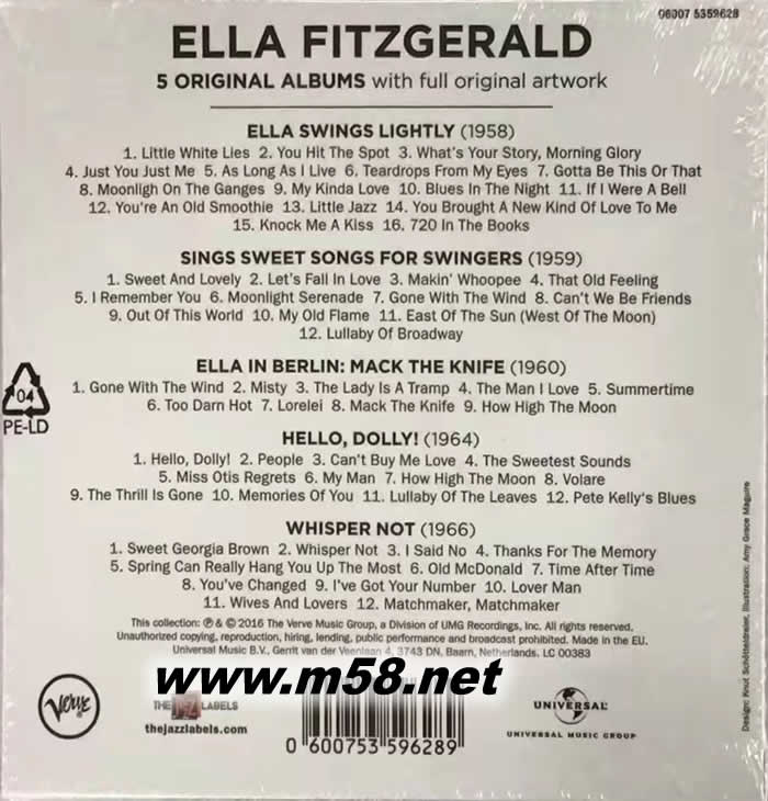 CD 1 1. Little White Lies 2. You Hit The Spot 3. What`s Your Story Morning Glory 4. Just You, Just Me 5. As Long As I Live 6. Teardrops From My Eyes 7. Gotta Be This Or That 8. Moonlight On The Ganges 9. My Kinda Love 10. Blues In The Night 11. If I Were A Bell 12. You`re An Old Smoothie 13. Little Jazz 14. You Brought A New Kind Of Love To Me 15. Knock Me A Kiss 16. 720 In The Books 17. Oh, What A Night For Love (Long Version) 18. Little Jazz (Alternate Take) 19. Dreams Are Made For Children 20. Oh, What A Night For Love - (previously unreleased) Sings Sweet Songs for Swingers CD 2 1. Sweet and Lovely 2. Let’s Fall In Love 3. Makin’ Whoopee 4. That Old Feeling 5. I Remember You 6. Moonlight Serenade 7. Gone With The Wind 8. Can’t We Be Friends? 9. Out of this World 10. My Old Flame 11. East Of The Sun (West Of The Moon) 12. Lullaby Of Broadway CD 3 1. Setting Up The Stage / Tuning Up / Granz And Fitzgerald Talking 2. That Old Black Magic 3. Our Love Is Here To Stay 4. Gone With The Wind 5. Misty 6. Applause And Fanfare Interlude 7. The Lady Is A Tramp 8. Fanfare And Announcement 9. The Man I Love 10. Love For Sale 11. Just One Of Those Things 12. Summertime 13. Too Darn Hot 14. Applause And Fanfare Interlude 15. Lorelei 16. Mack the knife 17. Fanfare And Announcement 18. How High The Moon 19. Applause And Closing Fanfare CD 4 1. Hello, Dolly! 2. People 3. Can’t Buy Me Love 4. Sweetest Sounds 5. Miss Otis Regrets 6. My Man 7. How High the Moon 8. Volare 9. Thrill Is Gone 10. Memories of You 11. Lullaby of the Leaves 12. Pete Kelly’s Blues CD 5 1. Sweet Georgia Brown 2. Whisper Not 3. I Said No 4. Thanks for the Memory 5. Spring Can Really Hang You Up the Most 6. Old MacDonald 7. Time After Time 8. You’ve Changed 9. I’ve Got Your Number 10. Lover Man 11. Wives and Lovers 12. Matchmaker, Matchmaker