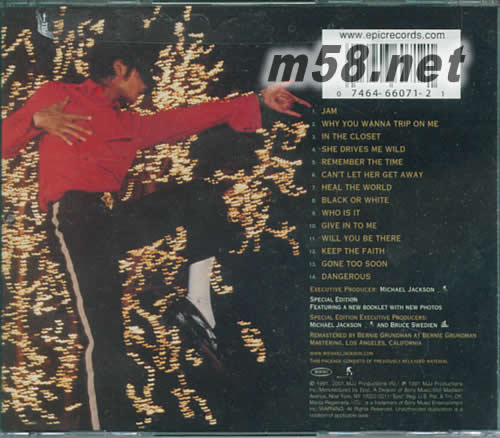 1.JAM 2.WHY YOU WANNA TRIP ON ME 3.IN THE CLOSET 4.SHE DRIVES ME WILD 5.REMEMBER THE TIME 6.CAN'T LET HER GET AWAY 7.HEAL THE WORLD 8.BLACD OR WHITE 9.WHO IS IT 10.GIVE IN TO ME 11.WILL YOU BE THERE 12.KEEP THE FAITH 13.GONE TOO SOON 14.DANGEROUS