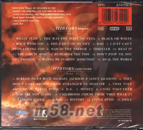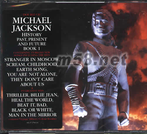 HISTORY 2CD 歐洲版 歷史精選(m58.net) MICHAEL JACKSON HISTORY PAST,PRESENT AND FUTURE BOOK 1 CONTAINING 15 BRAND NEW SONGS INCLI DLNG THE HITS STRANGER IN MOSCOW,SCREAM,CHILDHOOD,EARTH SONG,YOU ARE NOT ALONE,THEY DON’T CARE ABOUT US 15GREATEST HITS THRILLER,BILLIE JEAN,HEAL THE WORLD,BEAT IT,BAD, BLACD OR WHITE,MAN IN THE MIRROR