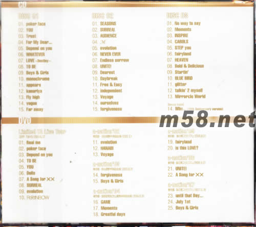《DVD収録內容》 (全25曲収録 ※全曲完全未発売ライヴ映像!) ○ Limited TA Live Tour (ZEPP TOKYO:2003.5.27) 01.Real me 02.poker face 03.Depend on you 04.TO BE 05.YOU 06.Dolls 07.A Song for ×× 08.SURREAL 09.evolution 10. ○ a-nation'02 (お臺場野外特設會場 / 2002.9.1) 11.evolution 12.HANABI 13.Voyage ○ a-nation'03 (お臺場野外特設會場 / 2003.8.31) 14.forgiveness 15.Boys & Girls ○ a-nation'04 (國営昭和記念公園野外特設會場 / 2004.8.29) 16.GAME 17.Moments 18.Greatful days ○ a-nation'05 (東京都・味の素スタジアム / 2005.8.21) 19.fairyland 20.is this LOVE? ○ a-nation'06 (味の素スタジアム / 2006.8.27) 21.UNITE! 22.A Song for ×× ○ a-nation'07 (味の素スタジアム / 2007.8.26) 23.until that Day... 24.July 1st 25.Boys & Girls