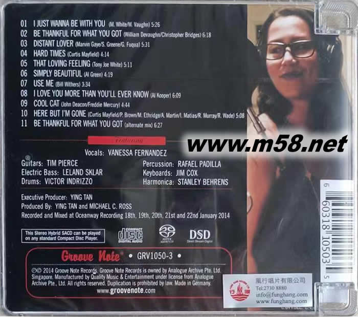 Use Me 令人驚嘆的聲音 SACD(m58.net) 樂界公認最具正統爵士靈魂風情的新加坡美聲女伶,醇厚優美的唱腔,充滿強大的音樂能量! ★「令人下巴掉下來的美聲」HiFi+音響雜誌破表推薦! ★ 大師錄音製作,完美保留寬廣動態與扎實人聲! ★ 全球最知名音響暨唱片評論家 Michael Fremer「音樂 10/11、音質 11/11」高度讚譽! 被喻為阿麗莎.富蘭克林與艾美.懷絲完美結合的凡妮莎.斐迪南,有著低沈且中氣十足、卻又醇厚優美且細膩的嗓音;這張由 Groove Note 唱片公司推出的專輯中,她在原音樂器純凈自然的伴奏下,演唱了許多 1970、80 年代的經典靈魂歌曲,充滿正統且復古的風格,令人大為驚艷。 這張由 Bernie Grundman 以類比真空管系統剪輯而成的作品,有著極為驚人的優異錄音效果,寬闊的音場中完美舒展出各種樂器的微小細節音色,人聲更是細膩而立體,最高品質 SACD 壓片更使得絕佳的錄音效果得以全面綻放。且相對於其他發燒片,本片的音樂性更是獲得評論者極高的讚譽,除卻凡妮莎.斐迪南本身高超的歌唱技巧,一群洛杉磯優秀音樂家的演出,更讓整體音樂充滿活力與獨特的生命,不僅是測試系統的最佳選擇,更是一份值得珍藏的藝術杰作!