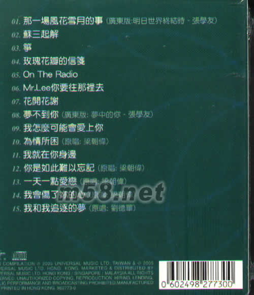 01. 那一場風花雪月的事(廣東版:明日世界終結時 -張學友) 02. 蘇三起解 03. 箏 04. 玫瑰花瓣的信箋 05. On The Radio 06. Mr.Lee你要往那里去 07. 花開花謝 08. 夢不到你(廣東版:夢中的你 -張學友) 09. 我怎么可能會愛上你 10. 為情所困(原唱:梁朝偉) 11. 我就在你身邊 12. 你是如此難以忘記(原唱:梁朝偉) 13. 一天一點愛戀(原唱:梁朝偉) 14. 我會傷了你的心(原唱:梁朝偉) 15. 我和我追逐的夢(原唱:劉德華)