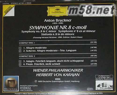 價格為估,以實到貨為準! 布魯赫納 第8交響曲 2CD(m58.net) 在交響史上,布魯克納的交響曲占據極重的地位,他是連接貝多芬與馬勒的橋梁,作為馬勒的恩師,他的作品是比較“健康”的。 卡拉揚的布魯克納真是越老越深沉。從早期在EMI的錄音,到DG 1970年代的二作馮婦,然后在最晚年仍然念念不忘,可見卡拉揚對布魯克納真的難以忘懷。他在慢板樂章所凝聚的音樂張力,精緻緊湊的弦樂與銅管部,將柏林愛樂催逼出無比瑰麗的音色。這是卡拉揚最偉大的錄音之一,也是布魯克納第八的首選版本。 企鵝三星帶花/留聲機世紀100大作/日本唱片名盤300,這種“三冠王”在古典唱片史上很少見的。 布魯克納的交響曲中成就最高的是第7和第8,氣勢磅礴、構思宏偉,內涵非常豐富,史詩性的作品。 總的來說第九“未完成”也是經典之作,少了第八中的憂郁、冥想,能感受到那種對生命的不懈。雖然布魯克納的作品非常的少,除了九首交響曲外再加上兩首后來找到的前期習作(0號和00號)交響曲,兩首彌撒曲等,就沒有了,但只有這些作品就足以確立他在古典音樂上的重要地位,和德奧音樂體系中承上啟下的的代表人。 就我個人來說,最喜歡的就是布魯克納的第八和第九了。(這東西不是我寫的,文章作者居然沒有寫第7,不知道他是不是忘了布魯克納還寫過一部叫做“Symphony #7 in E Major”的偉大作品,或者是沒聽過第7。) 布魯克納、馬勒的作品都很少,但其交響樂數量在他們所處的時代就不算少了!而且章章獨立成篇,他們專攻交響領域,無暇顧及其他體裁,這也充分保證了作品的質量。雖然同時代還有舒伯特、德沃夏克、勃拉姆斯等大師,但他們的交響曲從深度、廣度以及影響力來說,還有所欠缺。他們的室內樂、協奏曲等比交響成就要高,雜而不精啊! 布魯克納的作品宗教性太強,致使不太容易入手。但它龐大的構架,嚴謹的組織,不愧為Beethoven衣缽的繼承者。大家可以從第四“Romantic”先入手。 不少批評家說布魯克納交響曲結尾虎頭蛇尾,草草收場,這部第8就是最好的反擊! 第4樂章滂沱大氣,結構嚴密,精彩紛呈。大有壓倒之勢。 雖說交響曲不能拆開來聽,但我還是喜歡只聽第八的三四樂章,因為覺得只是這兩個樂章就能表現出完整的世界,尤其是第三樂章,他帶給你的感受決不是一般意義上的好聽,這是中緩緩升成的、無窮無盡的世界,在所有的交響曲中只有貝九的第三樂章才具有這樣的規模,表現出來的都是那種宇宙的永恒和個人的渺小。卡拉揚指揮的第八是我聽過的最好版本,我以前形容過這首交響曲對我來說是“溫暖”的,維也納愛樂的金色的音響也更加完美的突出了這一點。布魯克納的音樂或許難懂,但你認真傾聽,你就能體會到音樂中細膩的情感.
