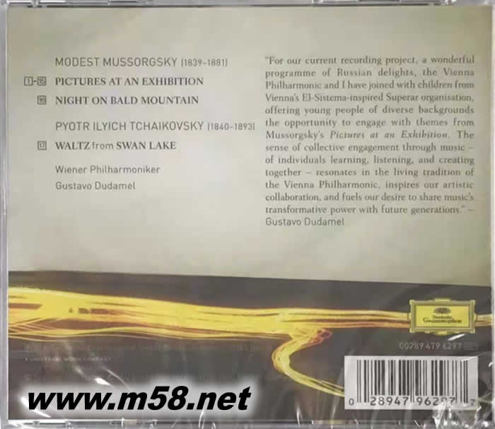 穆索爾斯基:圖畫展覽會 Mussorgsky: Pictures At An Exhibition(m58.net) 作為Deutsche Grammophon的獨家錄音藝術(shù)家慶祝十周年,Gustavo Dudamel的職業(yè)生涯已從委內(nèi)瑞拉Wunderkind演變?yōu)槭澜缟献罱艹龊妥钍軞g迎的Maestros之一。他即將錄制的唱片是2016年4月在維也納音樂博物館(Musikverein)與維也納愛樂樂團(Wiener Philharmoniker)一起制作的,是全俄羅斯的專輯-結(jié)合了Mussorgsky的兩幅作品,Ravel宏偉的編排中的Pictures at a Exhibition,以及Bald Mountain的A Night on Bald,柴可夫斯基天鵝湖上著名的華爾茲舞。維也納華爾茲國王和達達梅爾(Dudamel)使這個常年的芭蕾舞劇著重于新鮮,生機勃勃的新讀物-完美地介紹了節(jié)日季節(jié)。展覽中的圖片是音樂中轉(zhuǎn)錄最完整,排列最整齊的作品之一,是音樂的試金石,啟發(fā)了許多藝術(shù)家