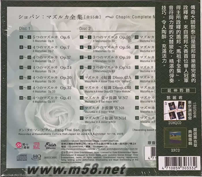 蕭邦:馬祖卡55曲全集 2HQCD(m58.net) HQCD是日本Memory-Tech公司所開發(fā)的高質(zhì)感CD。CD基版的材料採用超薄型液晶面版等級(jí)的聚碳酸脂是其特徵之一。聚碳酸脂比過去的樹脂流動(dòng)性、轉(zhuǎn)寫性及透光性更好,讓生產(chǎn)原盤的復(fù)製工作變得更加精密。因?yàn)楦咄该餍浴⒌碗p折射性兼?zhèn)渌宰x取雷射的入射光使得結(jié)晶體安定、抑制散光因此比一般的CD更能正確的讀取訊號(hào)資料。這個(gè)材質(zhì)的不同之處是聲音的顆粒細(xì)膩、解析度、透明感、臨場感等都極大提升且充份發(fā)揮聲音的效果。 大大提升品質(zhì)與更精確讀取數(shù)據(jù) 比普通CD更近乎原音的高品質(zhì)音色傳奇大師鄧泰山是蕭邦音樂最完美的詮釋者,來自蕭邦大賽首位華人冠軍得主所詮釋的蕭邦「馬祖卡全集」,音符與力度的交替變化,精湛的彈奏技巧,令人陶醉,充滿活力。 左撇子的鄧泰山5歲跟媽媽學(xué)琴,7歲的他為了躲避越戰(zhàn),和媽媽在內(nèi)的河內(nèi)音樂學(xué)院全校幾百名師生與幾十件的樂器,全部遷至深山里。鄧泰山從小有一副好耳力,那時(shí)每位學(xué)生每天只能分配到20分鐘的練習(xí)時(shí)間,讓他更珍惜每次的練琴機(jī)會(huì),也培養(yǎng)了他對(duì)音樂的專注力。 1970年,鄧泰山的母親受邀參觀波蘭華沙的蕭邦鋼琴大賽,回程她帶了很多蕭邦的樂譜和唱片。12歲的鄧泰山第一次聽到阿根廷女鋼琴家阿格麗希演奏蕭邦第一號(hào)鋼琴協(xié)奏曲時(shí),從此迷上了蕭邦。 16歲的鄧泰山帶著僅有的50元美金進(jìn)入莫斯科音樂學(xué)院,師事納坦森與巴許基洛夫。考官給他的評(píng)語是:「手指尚待訓(xùn)練,但很有音樂性」。頭一年納坦森讚許他進(jìn)步神速,而他認(rèn)為那是因?yàn)樵谀侵八麖奈磸椷^一部 「正常」的鋼琴。 3年后,他被學(xué)校推舉出去參加蕭邦鋼琴大賽,鄧泰山與奪冠呼聲最高的波哥雷利奇,是莫斯科音樂學(xué)院的同班同學(xué),后來波哥雷利奇未能進(jìn)入決賽,戴著厚厚的眼鏡、窮到差點(diǎn)連上臺(tái)禮服都沒有的鄧泰山,一路過關(guān)斬將成為第十屆蕭邦鋼琴大賽的冠軍,這是該賽創(chuàng)辦53年來第一次由亞洲人獲得這個(gè)獎(jiǎng)項(xiàng),同時(shí)他還摘下了協(xié)奏曲、波蘭舞曲和象徵蕭邦靈魂的馬祖卡獎(jiǎng),當(dāng)時(shí)他22歲。這張蕭邦的【馬祖卡55曲全集】,是鄧泰山在日本JVC的專業(yè)音樂大廠全新錄製發(fā)行的新專輯,來自蕭邦大賽首位華人冠軍得主,所詮釋的蕭邦-馬祖卡全集,讓人更加理解蕭邦語言的真正情懷。 大大提升品質(zhì)與更精確讀取數(shù)據(jù) 比普通CD更近乎原音的高品質(zhì)音色 多次世界巡迴演出,來自蕭邦大賽首位華人冠軍得主所詮釋的柴可夫斯基鋼琴套曲[四季],演奏音色優(yōu)美,讓人屏息凝神,值得一再欣賞再欣賞。 左撇子的鄧泰山5歲跟媽媽學(xué)琴,7歲的他為了躲避越戰(zhàn),和媽媽在內(nèi)的河內(nèi)音樂學(xué)院全校幾百名師生與幾十件的樂器,全部遷至深山里。鄧泰山從小有一副好耳力,那時(shí)每位學(xué)生每天只能分配到20分鐘的練習(xí)時(shí)間,讓他更珍惜每次的練琴機(jī)會(huì),也培養(yǎng)了他對(duì)音樂的專注力。 1970年,鄧泰山的母親受邀參觀波蘭華沙的蕭邦鋼琴大賽,回程她帶了很多蕭邦的樂譜和唱片。12歲的鄧泰山第一次聽到阿根廷女鋼琴家阿格麗希演奏蕭邦第一號(hào)鋼琴協(xié)奏曲時(shí),從此迷上了蕭邦。 16歲的鄧泰山帶著僅有的50元美金進(jìn)入莫斯科音樂學(xué)院,師事納坦森與巴許基洛夫。考官給他的評(píng)語是:「手指尚待訓(xùn)練,但很有音樂性」。頭一年納坦森讚許他進(jìn)步神速,而他認(rèn)為那是因?yàn)樵谀侵八麖奈磸椷^一部「正常」的鋼琴。 3年后,他被學(xué)校推舉出去參加蕭邦鋼琴大賽,鄧泰山與奪冠呼聲最高的波哥雷利奇,是莫斯科音樂學(xué)院的同班同學(xué),后來波哥雷利奇未能進(jìn)入決賽,戴著厚厚的眼鏡、窮到差點(diǎn)連上臺(tái)禮服都沒有的鄧泰山,一路過關(guān)斬將成為第十屆蕭邦鋼琴大賽的冠軍,這是該賽創(chuàng)辦53年來第一次由亞洲人獲得這個(gè)獎(jiǎng)項(xiàng),同時(shí)他還摘下了協(xié)奏曲、波蘭舞曲和象徵蕭邦靈魂的馬祖卡獎(jiǎng),當(dāng)時(shí)他22歲。 柴可夫斯基鋼琴套曲《四季》,副題為“性格描繪十二幅"。全曲由十二首附有標(biāo)題的獨(dú)立小曲組成。這些詩篇又與十二個(gè)月的季節(jié)特點(diǎn)相關(guān)聯(lián),故樂曲以 “四季" 為名。