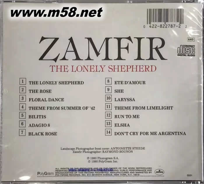 孤獨的牧羊人 THE Lonely Shepherd(m58.net) 排簫,又名潘笛。據記載,在久遠的古希臘文明時期,排簫就已發明用作樂器,所以排蕭已經有上千年的歷史了。 《孤獨的牧羊人 The Lonely Shepherd》這張專輯是當今世界最有影響力的排簫演奏大師Gheorghe Zamfir(格奧爾基·贊菲爾)的作品,在1987年由PolyGram 寶麗金公司進行后期混音制作