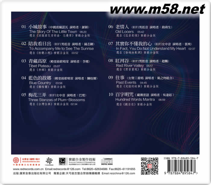 01 小城故事 (中國波薩諾瓦 演唱者:謝穎) The Story Of The Little Town 06:20 選自《波薩諾瓦首部曲·忘憂草》紫銀合金版 02 陪我看日出 (HIFI男低音 演唱者:鐘志剛) To Accompany Me to See The Sunrise 選自《聆聽小剛》紫銀合金版 03:52 03 青藏高原 (殿堂級歌唱家 演唱者:李娜) Tibet Plateau 05:07 選自《李娜》紫銀合金版 04 藍(lán)色的故鄉(xiāng) (殿堂級歌唱家 演唱者:騰格爾) Blue Country 03:58 選自《騰格爾》紫銀合金版 05 梅花三弄 (HIFI女中音 演唱者:巴度) Three Stanzas of Plum-Blossoms 選自《臺灣往事》紫銀合金版 02:34 06 老情人 (HIFI男低音 演唱者:錢萌生) Old Locers 05:42 選自《低音柔情》紫銀合金版 07 其實你不懂我的心 (HIFI女中音 演唱者:張爽) In Fact, You Do Not Understand My Heart 02:37 選自《發(fā)燒詠嘆調(diào)》紫銀合金版 08 紅河谷 (HIFI男低音 演唱者:趙鵬) Red River Valley 05:17 選自《原音重現(xiàn)》紫銀合金版 09 往事 (女聲三重唱 演唱者:風(fēng)之吻組合) Past Events 04:45 選自《光陰的故事》紫銀合金版 10 百字明咒(藏傳密語 演唱者:吳達(dá)鎔) Hundred Words Mantra 06:59 選自《觀自在》紫銀合金版