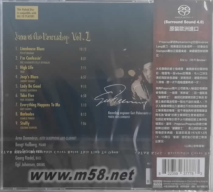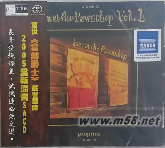 JAZZ AT THE PAWNSHOP VOL 1當鋪爵士 SACD(m58.net) 這一張CD可以說是爵士樂的經典及必聽之作。爵士經典那么多,但是這一張CD卻一直暢銷了十余年了,眾家唱片行還是照賣不誤,永遠有新一代的樂友購買這一張CD,這在爵士音樂銷售史上實在是一異數。 本CD為何被公認是爵士樂必聽的經典之作,且全世界音響迷及音響設計家都做為測試CD呢(舉世一半以上的音響廠商都曾推薦過本CD)?因為本片將小酒館那種煙霧彌漫的氣氛、樂手盡興愉快的表演情形活生生的表現出來!因為爵士樂之迷人在于活生感、現場感以及歌手即興富有親和力的表演,很容易讓現場聆聽者的情緒陷入HIGT的境界,尤其是Take Five時間。 「Take Five」是爵士樂里的特有名詞,在屬于大樂團的時代里,樂手為了出頭就得自己爭取Solo(獨奏)的機會,藉以引起大家注意,那最簡單的方法是什么呢?就是利用整個樂團表演告一段落,團長宣布「休息五分鐘」的時候來大顯身手。其中「當鋪爵士」系列就可說是 Take Five最有名的CD,此CD的「Take Five」節奏明快,幾個樂手輪翻上陣,鋼琴飆起來讓人不自覺的打拍子,把這寶貴的五分鐘利用的相當徹底! 在馬浚的「音響天書」中所訪問全世界最著名的音響設計師中,有近一半的人都推薦這一張「當鋪爵士」。