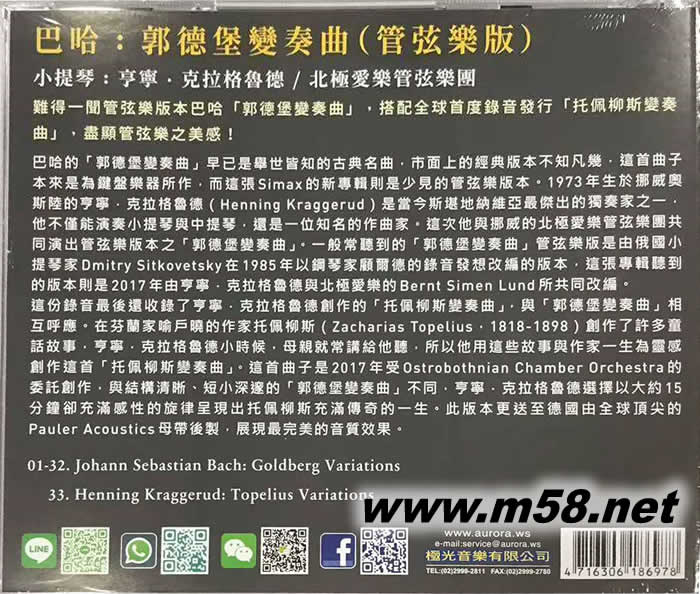 巴赫 哥德堡變奏曲GOLDBERG (管弦樂版)(m58.net) 巴哈的「郭德堡變奏曲」早已是舉世皆知的古典名曲,市面上的經典版本不知凡幾,這首曲子本來是為鍵盤樂器所作,而這張Simax的新專輯則是少見的管弦樂版本。1973年生於挪威奧斯陸的亨寧.克拉格魯德(Henning Kraggerud)是當今斯堪地納維亞最杰出的獨奏家之一,他不僅能演奏小提琴與中提琴,還是一位知名的作曲家。這次他與挪威的北極愛樂管弦樂團共同演出管弦樂版本之「郭德堡變奏曲」。一般常聽到的「郭德堡變奏曲」管弦樂版是由俄國小提琴家Dmitry Sitkovetsky在1985年以鋼琴家顧爾德的錄音發想改編的版本,這張專輯聽到的版本則是2017年由亨寧.克拉格魯德與北極愛樂的Bernt Simen Lund所共同改編。 這份錄音最后還收錄了亨寧.克拉格魯德創作的「托佩柳斯變奏曲」,與「郭德堡變奏曲」相互呼應。在芬蘭家喻戶曉的作家托佩柳斯(Zacharias Topelius,1818-1898)創作了許多童話故事,亨寧.克拉格魯德小時候,母親就常講給他聽,所以他用這些故事與作家一生為靈感創作這首「托佩柳斯變奏曲」。這首曲子是2017年受Ostrobothnian Chamber Orchestra的委託創作,與結構清晰、短小深邃的「郭德堡變奏曲」不同,亨寧.克拉格魯德選擇以大約15分鐘卻充滿感性的旋律呈現出托佩柳斯充滿傳奇的一生。此版本更送至德國由全球頂尖的Pauler Acoustics母帶后製,展現最完美的音質效果。
