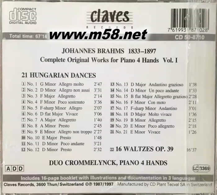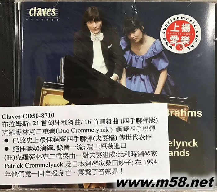 布拉姆斯: 21首匈牙利舞曲/ 16首圓舞曲 (四手聯(lián)彈版)Brahms: Complete Original Works for Piano 4 Hands Vol. I(m58.net) 已故史上最佳鋼琴四手聯(lián)彈(夫妻檔) 傳世代表作 絕佳默契演繹, 錄音一流; 瑞士原裝進口 (註)克羅麥林克二重奏由一對夫妻組成:比利時鋼琴家 Patrick Crommelynck 及日本鋼琴家桑田妙子; 在1994年他們竟一同自殺身亡,震驚了音樂界!