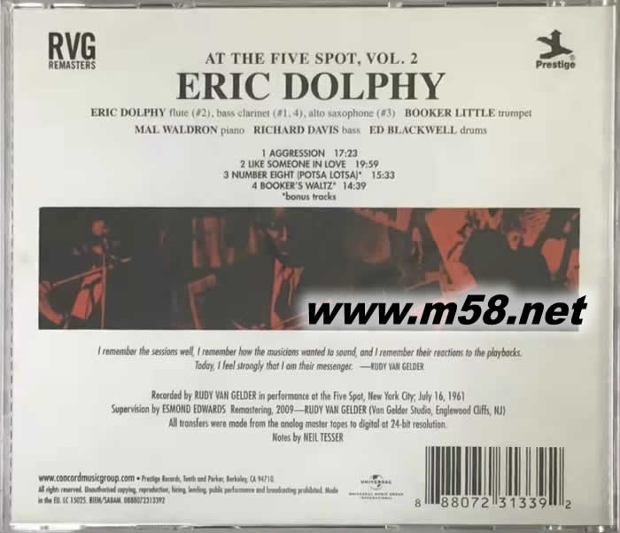 AT THE FIVE SPOT(薩克斯)(m58.net) 最經典的爵士樂作品可能在錄音室,但最精彩的爵士樂作品肯定來自現場演出。熱愛爵士樂的樂迷不應該忽略現場錄音的重要性,樂手與場下聽眾的熱情互動正是讓音樂張力直沖云霄的關鍵。 紐約的Five Sop俱樂部是個極富傳奇色彩的場子,1957年讓Thelonious Monk與John Coltrane的音樂生命由衰轉盛;1961年則成就了爵士史上最具創造力卻最短命的經典五重奏——Eric Dolphy & Booker Little Quintet。這個組合讓當時樂壇耳目一新,頗有繼往開來之勢。怎奈命運捉弄,兩位主角先后辭世,整個團隊當然應聲瓦解,就連鼓手Ed Blackwell也因尿毒癥必須靠定期洗腎維持生命。 該團隊留下的錄音不多,但張張經典,這張錄音作品是1961年7月16日在Five Spot俱樂部留下的傳奇,整晚的熱演分別記載在三張CD上,您手上的是第二輯,兩首曲子充分展現了五位天才樂手的魅力,名副其實的Hot Jazz! 艾瑞克?達菲(Eric Dolphy)曾被Miles Davis指責,亦被權威爵士樂雜志形容為“反爵士”,因為他的前衛樂風嚇跑不少傳統爵士樂衛道士,雖然如此,他卻被世人公認為前衛爵士樂中僅次于薩克斯風手Ornette Coleman的天才樂手。以中音薩克斯風、長笛、低音黑管為主要吹奏樂器,Eric Dolphy雖然以不對稱節奏及自由旋律為創作訴求,但他的吹奏力度與薩克斯風巨人Charlie Parker相比實在不相上下。此外,他的音域控制技巧,可媲美任何硬式咆勃技術派樂手。 Eric Dolphy于1928年生于美國洛杉磯,6歲時已經參與專業的巡回演出。1958年參與Chico Hamilton大樂團,他的才藝足以使得這支原本就光芒四射的隊伍更見特殊。上世紀60年代的Eric Dolphy,除了參與貝司手Charles Mingus樂團工作之外,并與Mal Waldron、Ron Carter、Jaki Byard等樂手合作錄音工作。1961年與小號手Booker Little的合作更激出燦爛的火花,雖然合作為期不到半年,但是他們在Five Spot的錄音演出卻成為現代爵士樂中的經典作品。1964年,Eric Dolphy的吹奏技巧已達爐火純青之境,這些可見于他的獨奏及雙重奏作品中,同年亦不幸去世。