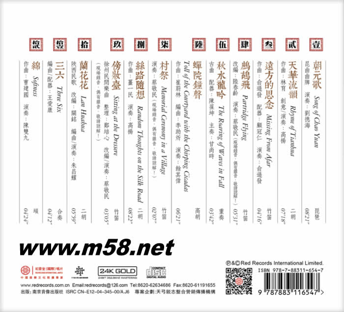 01 朝元歌 Song of Chao Yuan 08’21” 琵琶 昆曲曲牌 演奏:劉德海 02 天華流韻 Rhyme of Tianhua 07’18” 二胡 作曲:林育 創(chuàng)意/演奏:高揚(yáng) 03 遠(yuǎn)方的思念 Missing From Afar 04’16” 竹笛 作曲:俞遜發(fā) 配器:顧冠仁 演奏:俞遜發(fā) 04 鷓鴣飛 Partridge Flying 05’31” 竹笛 改編:陸春齡 演奏:蔡敬民(現(xiàn)場(chǎng)錄音,偶有雜音,敬請(qǐng)諒解!) 05 秋水龍吟 The Roaring of Waves in Fall 03’42” 重奏 古曲 配器:陳葆坤 主奏:甘尚時(shí) 06 禪院鐘聲 Toll of the Courtyard with the Chirping Cicadas 06’21” 高胡 作曲:崔蔚林 編曲:李助炘 演奏:余其偉 07 村祭 Memorial Ceremony in a Village 02’07” 竹笛 演奏:蔡敬民(現(xiàn)場(chǎng)錄音,偶有雜音,敬請(qǐng)諒解!) 08 絲路隨想 Random Thoughts on the Silk Road 08’22” 二胡 作曲:薑一民 演奏:高揚(yáng) 09 傍妝臺(tái) Sitting at the Dressere 03’05” 竹笛 徐州民間樂曲 整理:鄭培心 改編/演奏:蔡敬民 (現(xiàn)場(chǎng)錄音,偶有雜音,敬請(qǐng)諒解!) 10 蘭花花 Lan Huahua 05’59” 二胡 陜西民歌 改編:關(guān)銘 編曲/演奏:朱昌耀 11 三六 Three Six 04’12” 合奏 編曲/配器:王愛康 12 綿 Softness 04’24” 塤 作曲:曹建國(guó) 演奏:陳雙九
