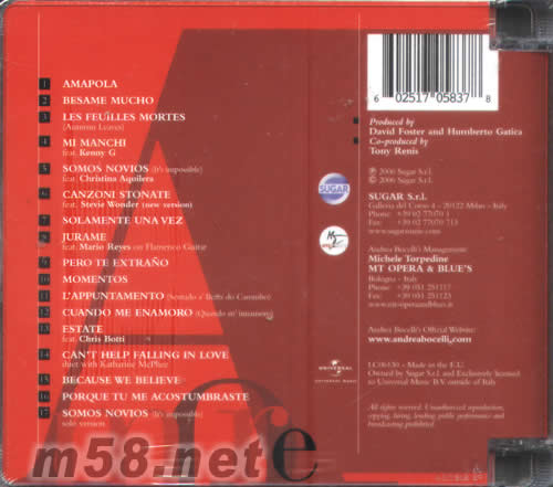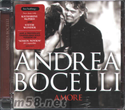 AMORE (擁抱封面) 愛(m58.net) 錄了15首歌曲,配樂相當出色而且有心思,透過西班牙吉他、傳統的拉丁打擊樂器、手風琴、口琴、大鋼琴、弦樂的鋪排為波伽利的浪漫歌聲編織一個熱情洋溢、引人入勝的愛情場景 專輯涵蓋1920-80年代的經典情歌,同時邀集葛萊美藝人跨刀獻藝:史提夫汪達、KennyG分別在"Mi Manchi"、"Canzoni Stonate"中擔任口琴、薩克斯風的吹奏,新世代歌后克里斯廷則在"Somos Novios"中與波伽利合唱。此外特別收錄波伽利與戴維佛斯特為2006年冬季奧運所譜寫的大會會歌"Because WeBelieve"。