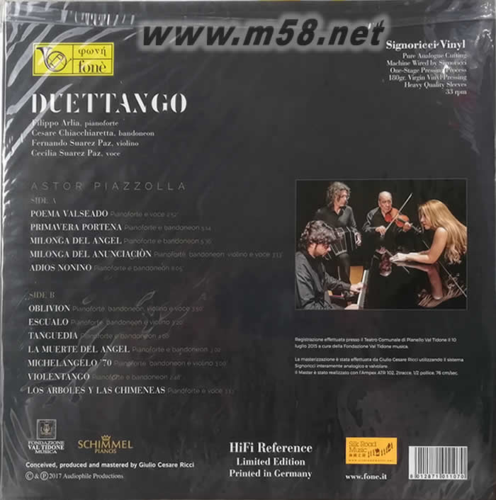 探戈二重奏[皮亞佐拉作品選]Duettango [Astor Piazzolla] 黑膠(m58.net) Filippo Arlia (pianoforte)、Fernando Suarez Paz (violin)、 Cesare Chiacchiaretta, (bandoneon)、Cecilia Suarez Paz (vocal) 向皮亞佐拉致敬集,十二首的不朽名作 鋼琴+小提琴+手風琴+女聲 將皮亞佐拉的作品以最接近原貌重現, 越聽越有味道 1. 意大利當代年青鋼琴家菲利普•阿利亞(Filippo Arlia)與手風琴家切薩雷•奇亞切雅烈達(Cesare Chiacchiaretta)於2008年成立二人組合「探戈二重奏(Duettango)」,他倆利用各自擅長的樂器致力探索和推廣探戈音樂,特別是探戈圖騰皮亞佐拉(Astor Piazzolla)的作品,他們如對話般的演奏別樹一格,可圈可點,贏得不少喝采聲。 2. 他倆伙拍馳名國際的小提琴奏家費爾南多•蘇亞雷斯•巴斯(Fernando Suarez Paz)及巴斯的女兒歌唱家塞西妮亞(Cecilia Suarez Paz)演繹十二首皮亞佐拉的不朽名作向這位大師致敬。 3. 阿利亞的鋼琴鏗鏘俐落配合奇亞切雅烈達矯揉圓滑的手風琴和巴斯輕鬆自然,線條分眀的小提琴演奏,加上塞西妮亞那磁性帶點沙唖卻充滿拉丁口味的歌唱,將皮亞佐拉的作品以最接近原貌重現,越聽越有味道。 4. LP : 著名錄音師里茲(Giulio Cesare Ricci)負責由錄音至母盤製造和壓片工序整個過程期間不作任何加強、調整和更改(one-stage pressing process),是純自然的模擬錄音(pure analogue natural sound recording)。在德國壓製的33轉180克處女黑膠唱片,全球限量出版496張,是聆聽另一名盤。 5. SACD : 著名錄音師里茲(Giulio Cesare Ricci)負責由錄音至母盤製造,配合以SACD為載體,無論是音場的高度、闊度和深度、對位和音響的清晰度等,皆達致最高規格,現場立體感十足,是獨一無二的鑑賞名盤。