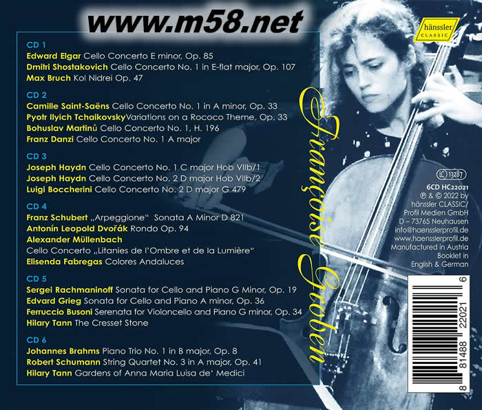 價(jià)格為估,以實(shí)到貨為準(zhǔn)! 安魂曲 大提琴 IN MEMORIAM 6CD套裝(m58.net) 著名的女大提琴家François Groben出生于1965年,盧森堡。五歲開始學(xué)習(xí)大提琴。她在音樂學(xué)院接受了專業(yè)的訓(xùn)練,并在很短的時(shí)間內(nèi)展現(xiàn)了非凡的天賦和技巧。 Groben在國際比賽中屢獲殊榮,她的演奏風(fēng)格充滿了激情和表現(xiàn)力。她經(jīng)常與世界各地的知名樂團(tuán)合作,并在世界各地的音樂廳和音樂節(jié)上演出。她的音樂表演深受觀眾和音樂評(píng)論家的贊賞。除了演奏,Groben還致力于音樂教育工作。她經(jīng)常在音樂學(xué)院和音樂營地?fù)?dān)任大提琴導(dǎo)師。 她擅長演奏德國、法國和盎格魯撒克遜作品。正是出于這個(gè)原因,盧森堡銀行將馬泰奧·戈夫里勒于1695年制造的古大提琴交給了她。 馬泰奧·戈夫里勒(MatteoGoffriller 1659–1742), 威尼斯制琴師,尤以制作優(yōu)質(zhì)的大提琴聞名。