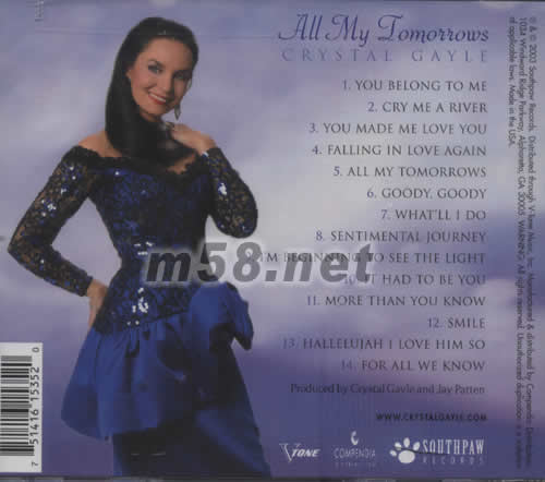 我的明日ALL MY TOMORROWS(m58.net) MADE IN USA CYSTAL GAYLE有著歌劇院落歌手完美的嗓音和布魯斯歌靈魂的世態家。她有高達18首冠軍單曲28首排行榜前5名歌曲。在20世紀70年代和80年代之間,她是當時鄉村音樂最炙手可熱的女手。而且她也經常獲得CMA、ACM和葛萊美大獎,1979年更成為第一位來到中國演出的鄉村音樂歌手。